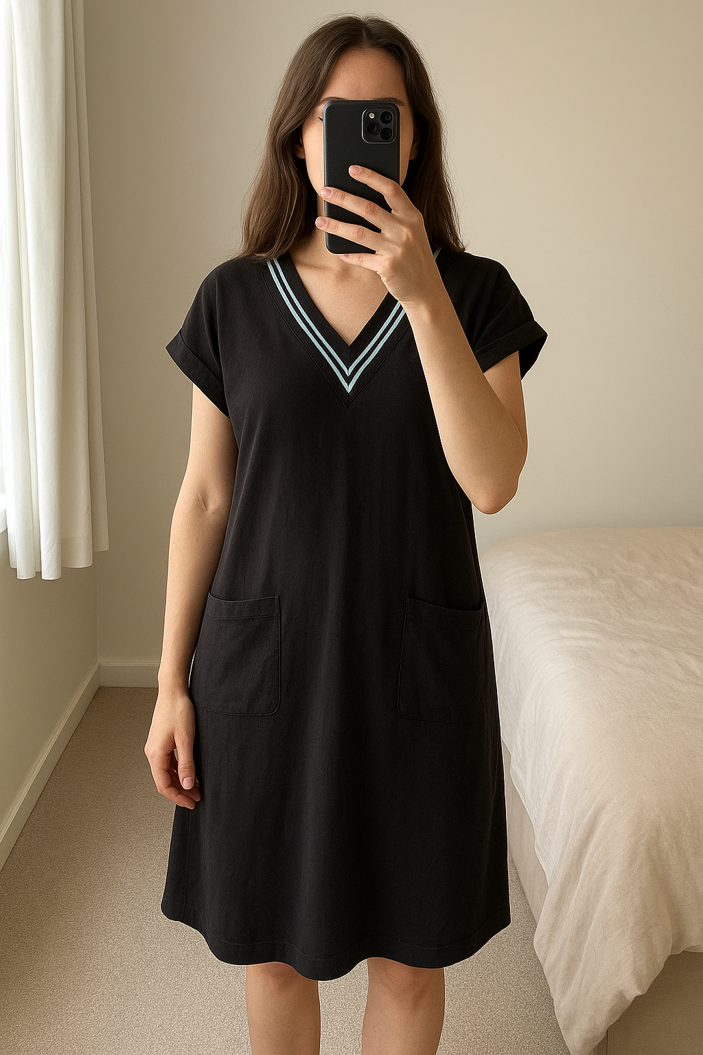 Next jersey mini dress black with light blue trim size 16 standing straight facing the camera, in a softly lit bedroom setting, with gentle natural light filtering through a window.