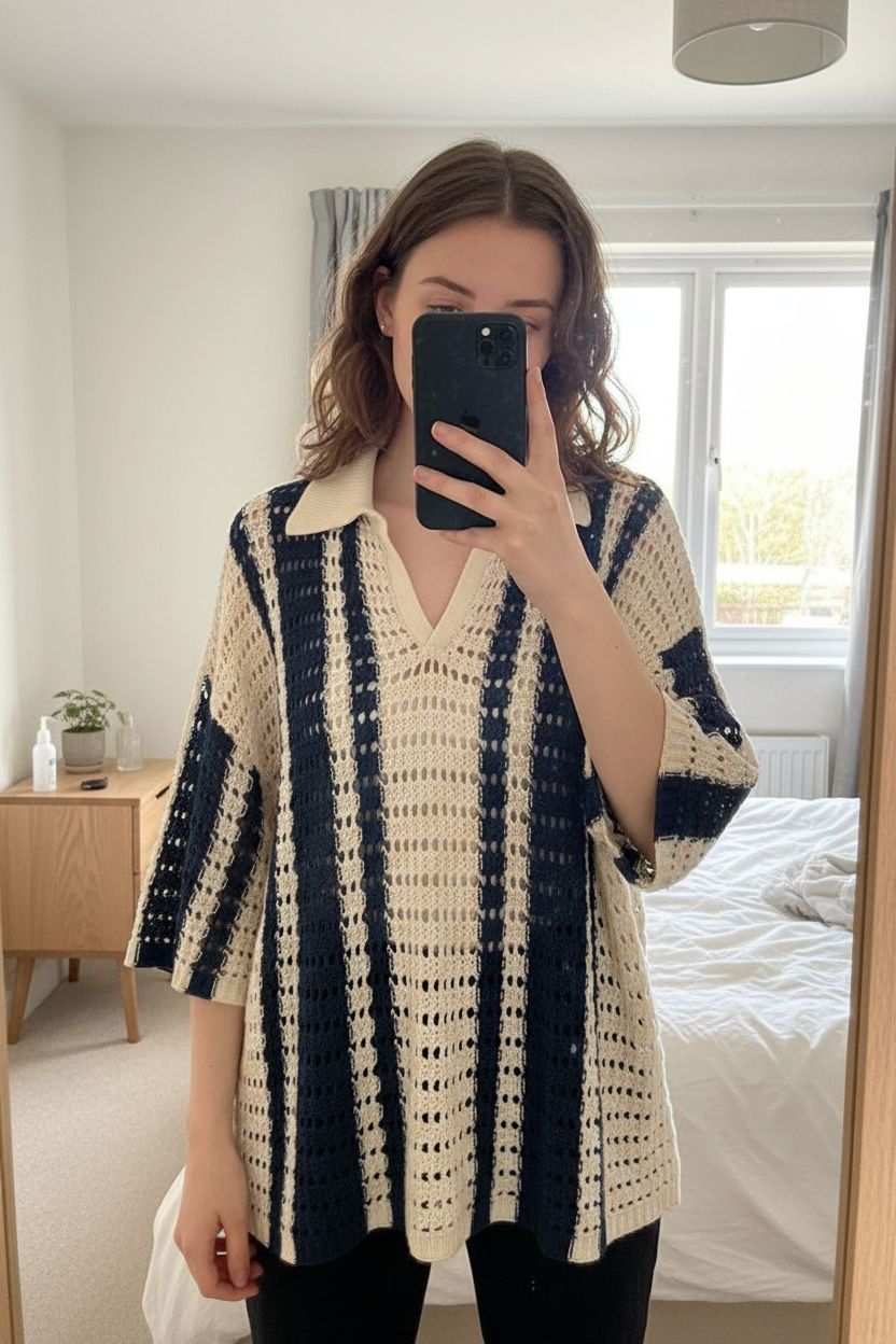 Next knitted, stripey Jumper navy and cream, size L standing straight facing the camera, in a softly lit bedroom setting, with gentle natural light filtering through a window.