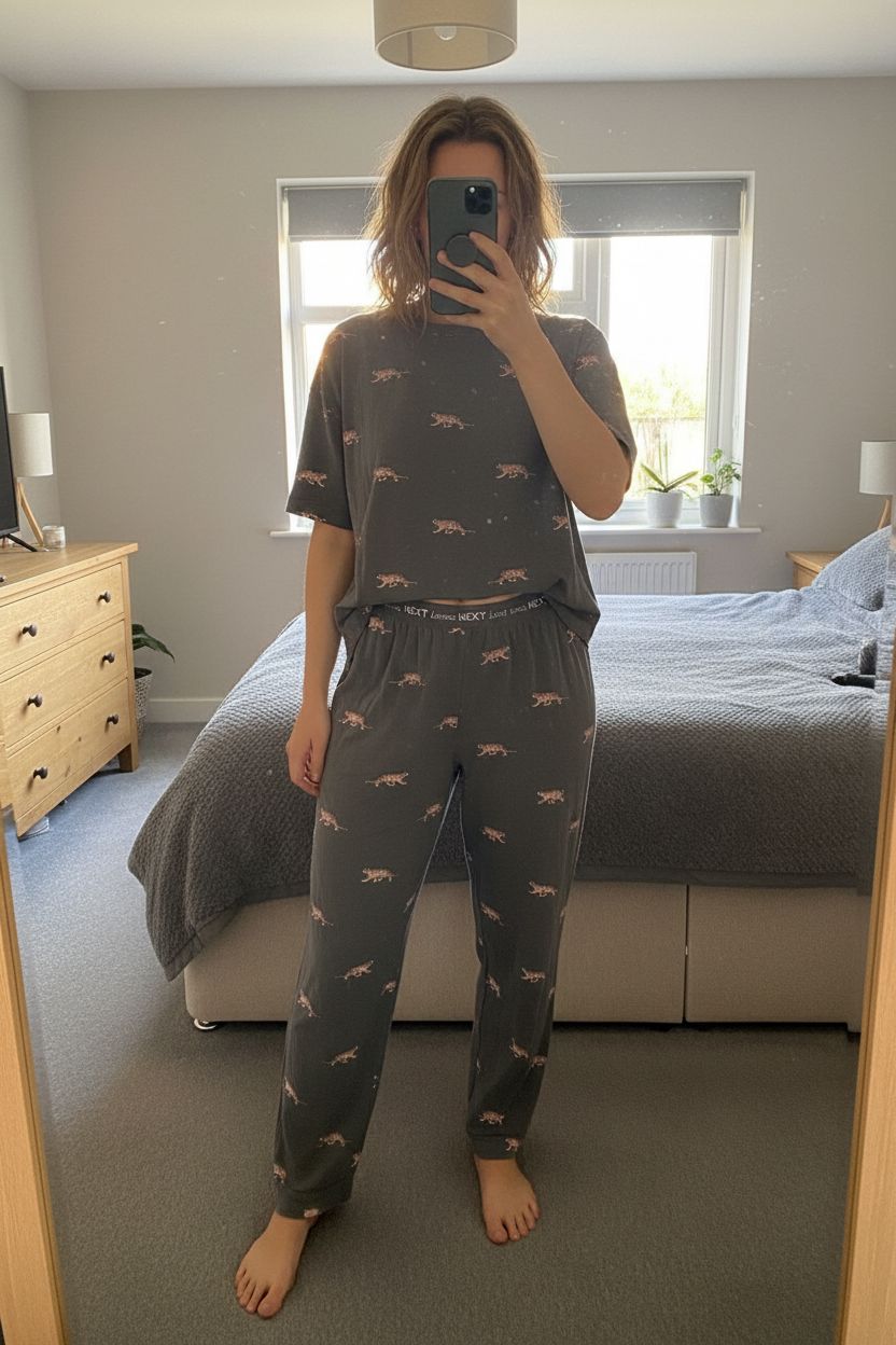 Next Large ladies Pyjamas Tiger print, Grey standing straight facing the camera, in a softly lit bedroom setting, with gentle natural light filtering through a window.