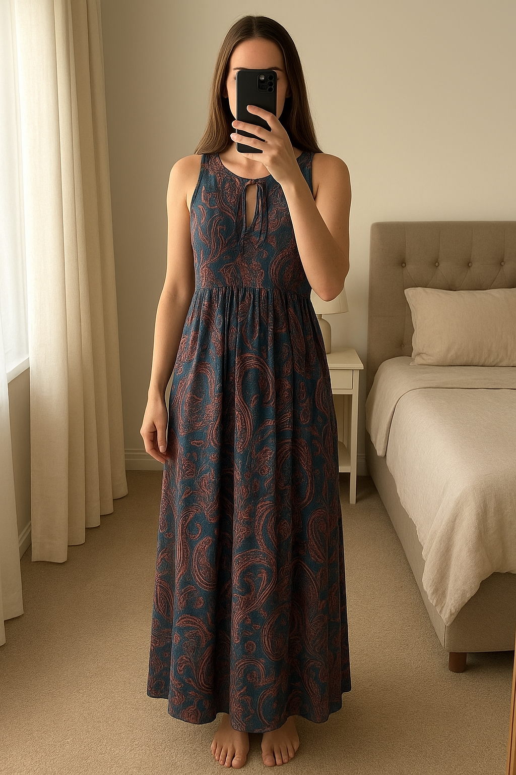 Next maxi dress standing straight facing the camera, in a softly lit bedroom setting, with gentle natural light filtering through a window.