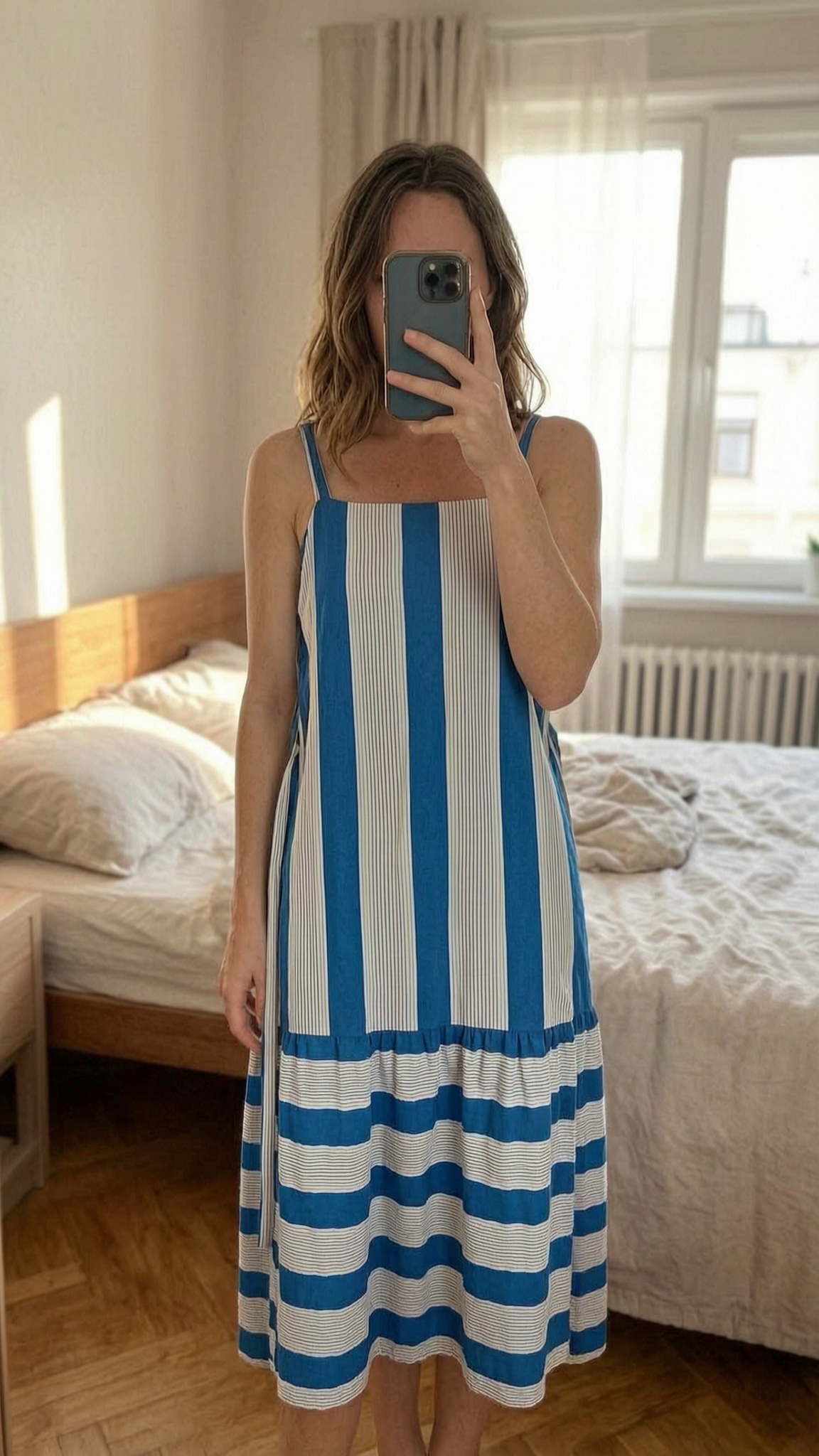 Next Midi Dress - Blue White Stripe - UK 12 standing straight facing the camera, in a softly lit bedroom setting, with gentle natural light filtering through a window.