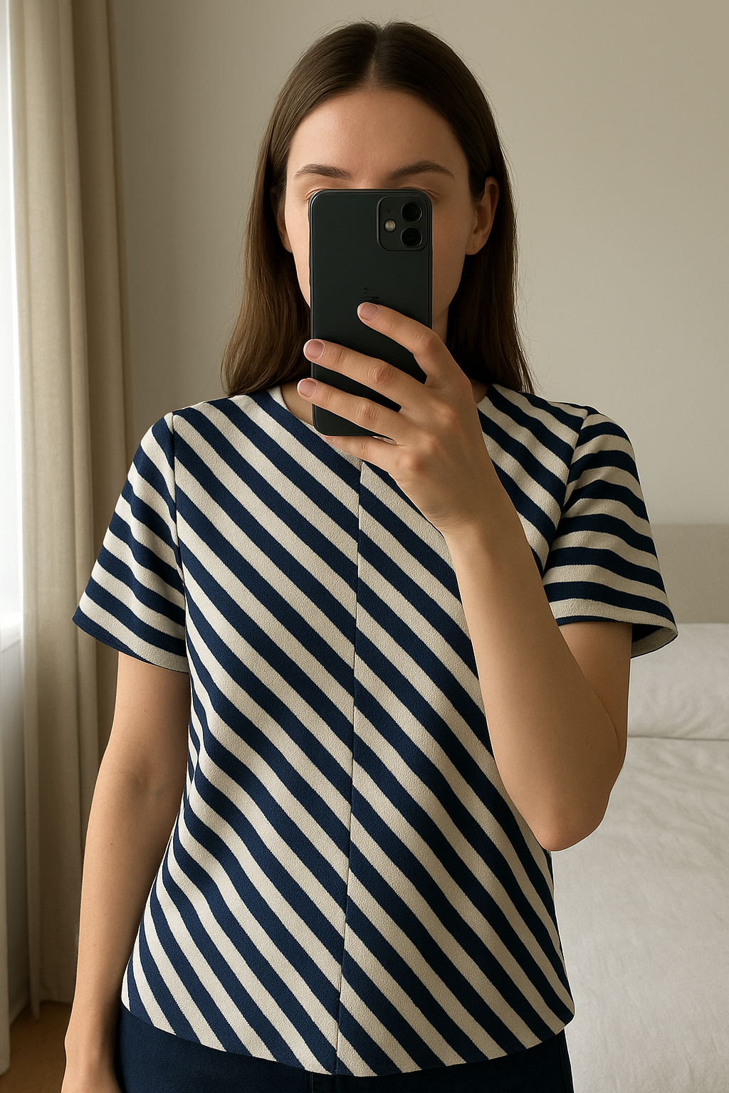 Next Navy and cream stripy top size 18. Crepe material standing straight facing the camera, in a softly lit bedroom setting, with gentle natural light filtering through a window.