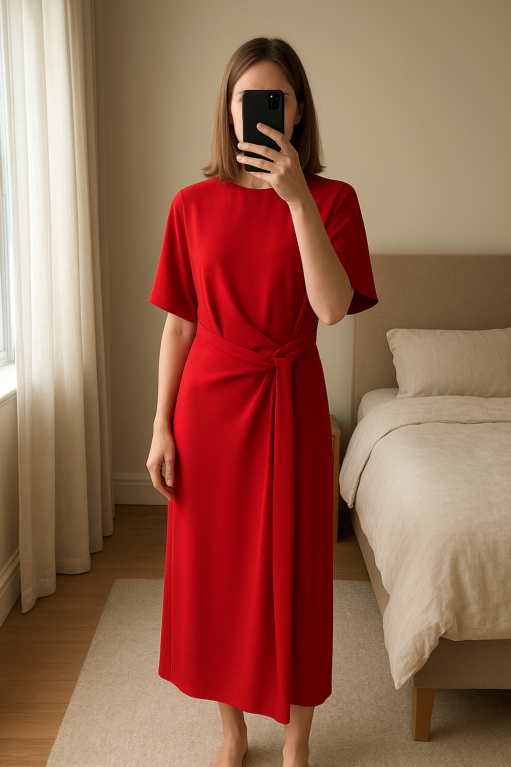 Next Red Midi Dress with Tie Detail – UK 18 standing straight facing the camera, in a softly lit bedroom setting, with gentle natural light filtering through a window.