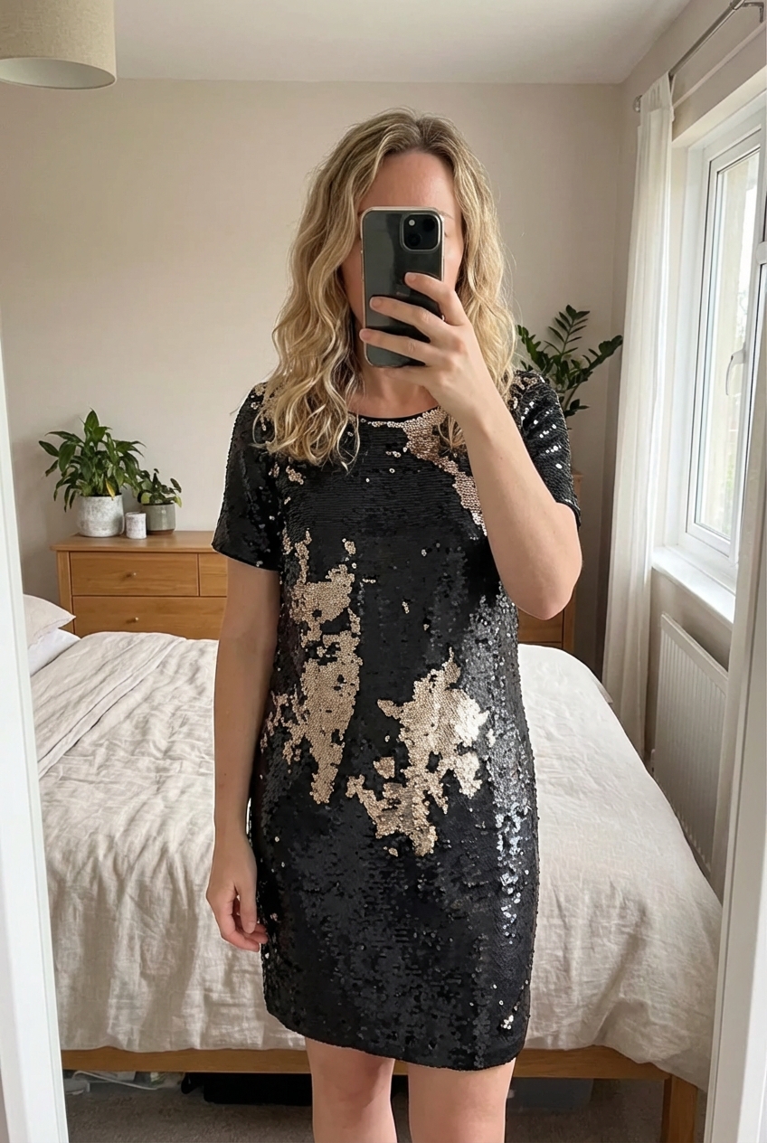 Next Reversible Sequin Party Dress – Size 12 standing straight facing the camera, in a softly lit bedroom setting, with gentle natural light filtering through a window.