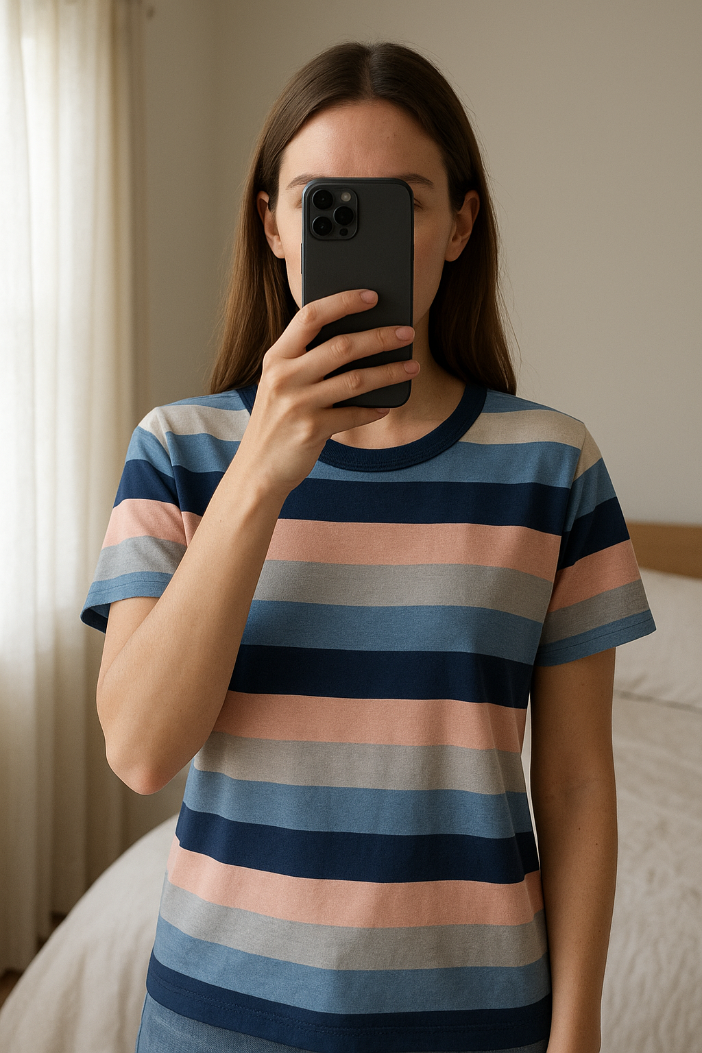 Next stripy T-shirt standing straight facing the camera, in a softly lit bedroom setting, with gentle natural light filtering through a window.