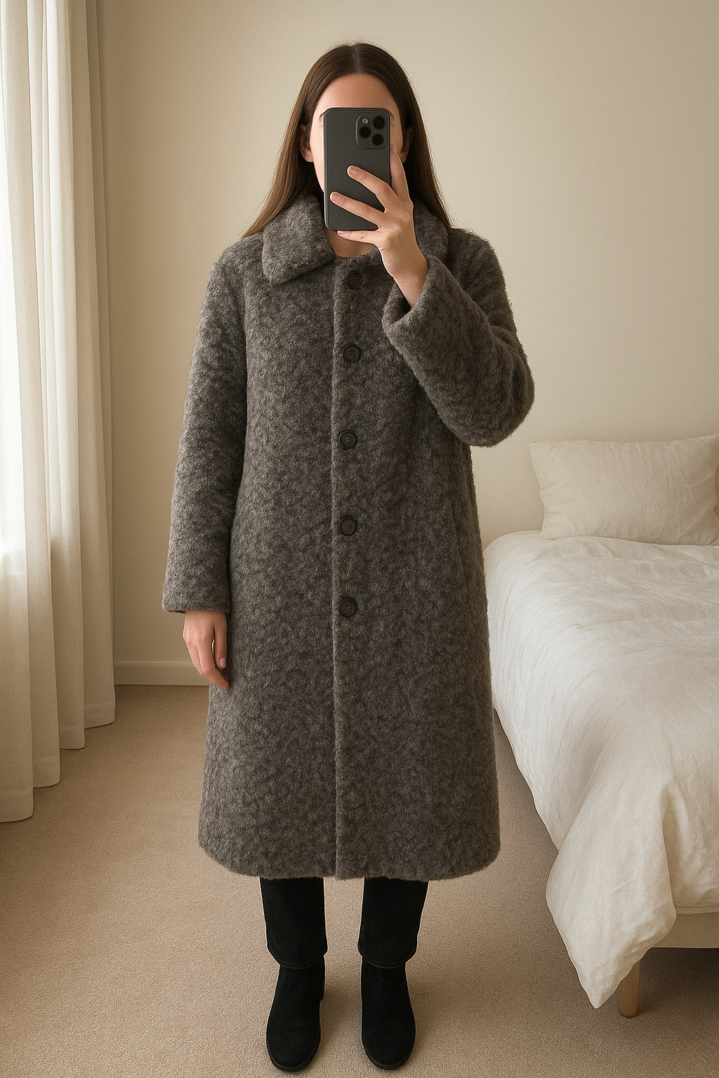 Next teddy coat grey Size Medium. Long length standing straight facing the camera, in a softly lit bedroom setting, with gentle natural light filtering through a window.