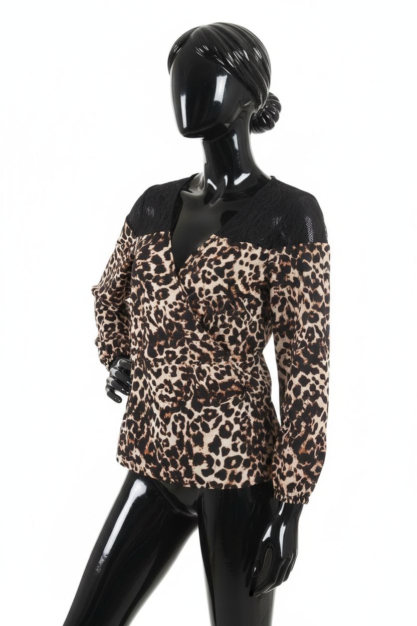 a glossy black plastic mannequin with no facial features in Next Women’s Animal Print Wrap Top Size 18 arching their back slightly for a dynamic pose, in a clean photo studio with seamless white backdrop and softbox lighting.
