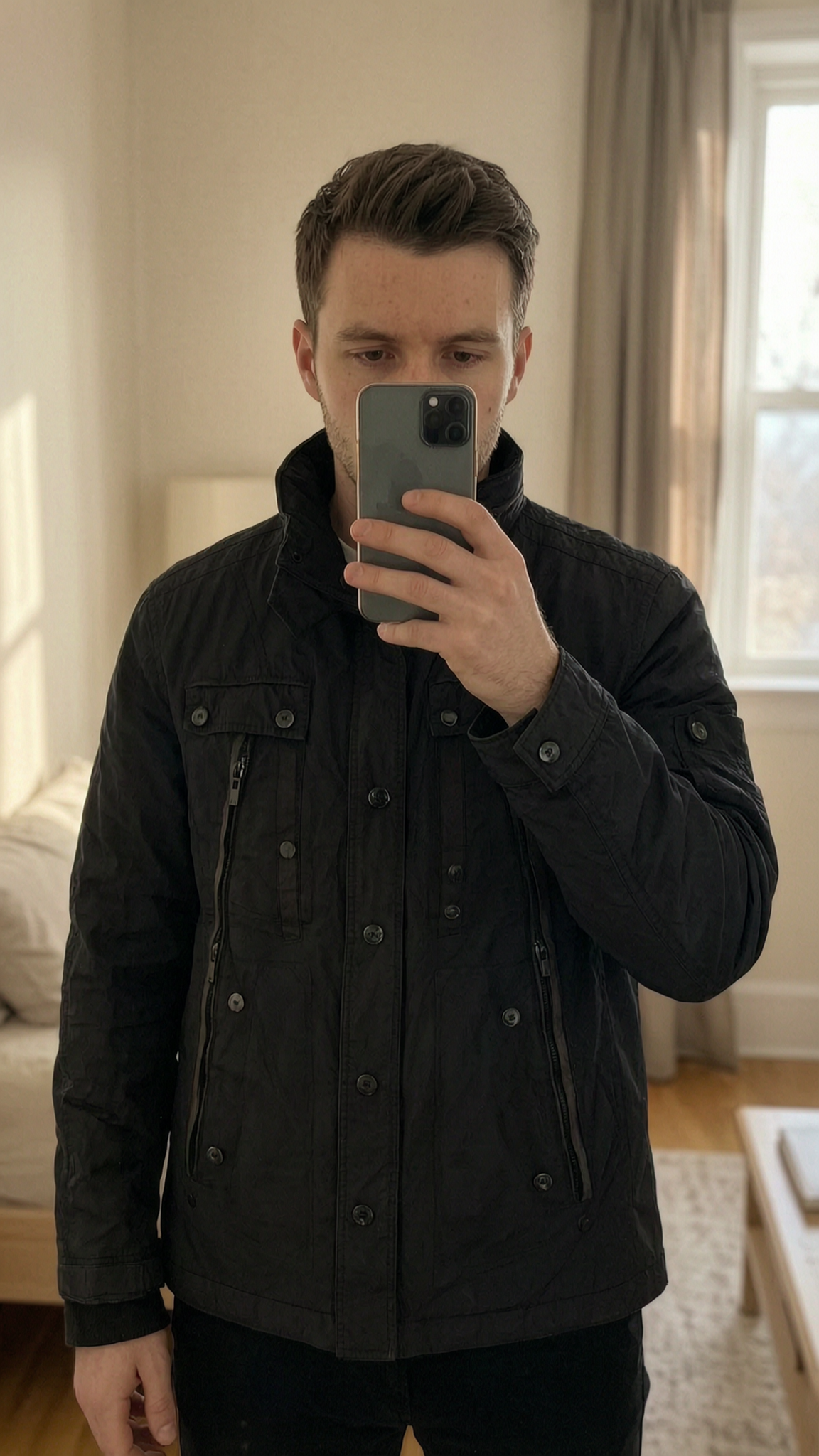 Next XL black biker style jacket standing straight facing the camera, in a softly lit bedroom setting, with gentle natural light filtering through a window.