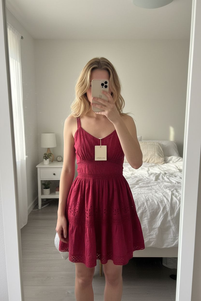 NIEUW rode jurk debout, face à la caméra, dans une chambre à la lumière douce, avec une lumière naturelle filtrant par la fenêtre.