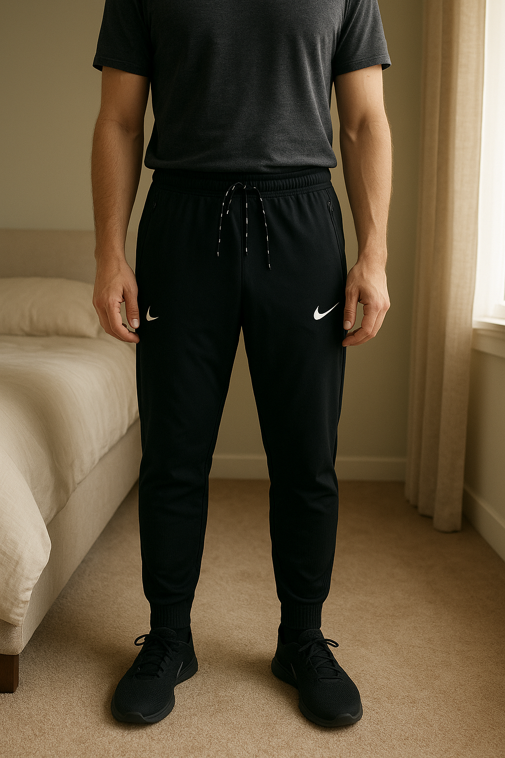 Nike Aeroswift taille M debout, face à la caméra, dans une chambre à la lumière douce, avec une lumière naturelle filtrant par la fenêtre.