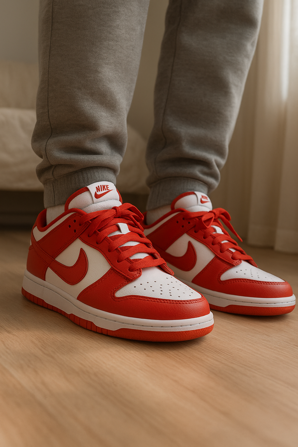 Nike Dunk Low debout, face à la caméra, dans une chambre à la lumière douce, avec une lumière naturelle filtrant par la fenêtre.