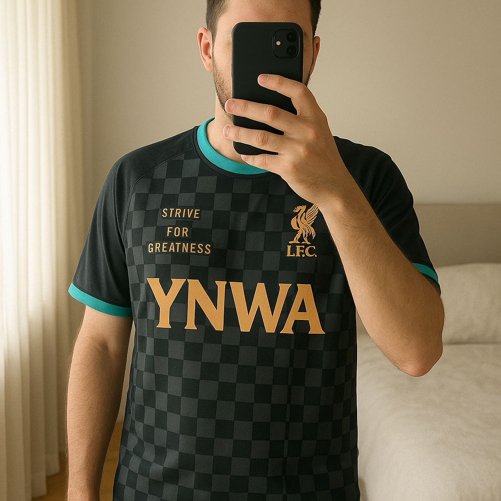 Nike Lebron X Liverpool FC Stadium Soccer Jersey Men's L Black Gold FZ3199-011 standing straight facing the camera, in a softly lit bedroom setting, with gentle natural light filtering through a window.