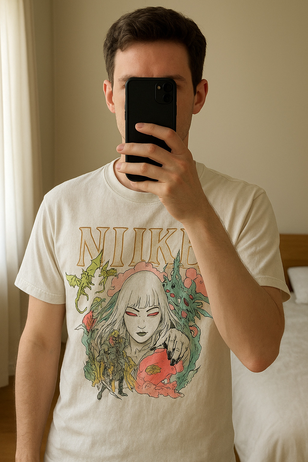 Nike Sportswear – T-shirt Fantasy / Dragon – Homme S (Tall) debout, face à la caméra, dans une chambre à la lumière douce, avec une lumière naturelle filtrant par la fenêtre.