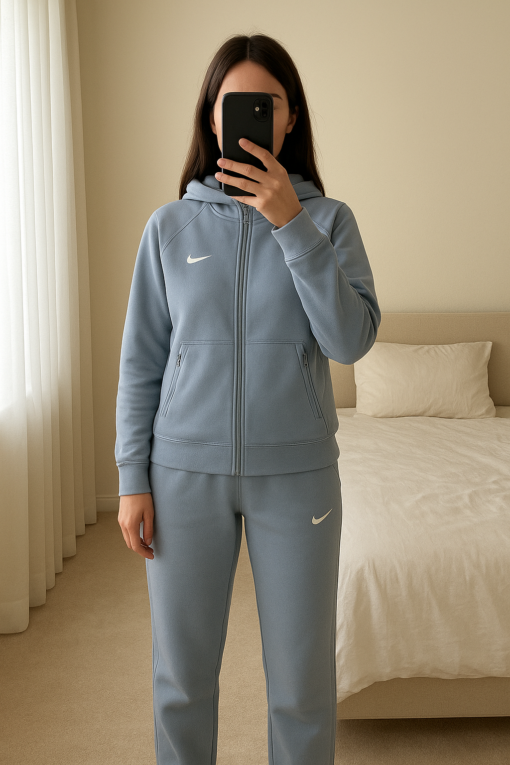 Nike x Nocta Ensemble ( bleu clair ) debout, face à la caméra, dans une chambre à la lumière douce, avec une lumière naturelle filtrant par la fenêtre.