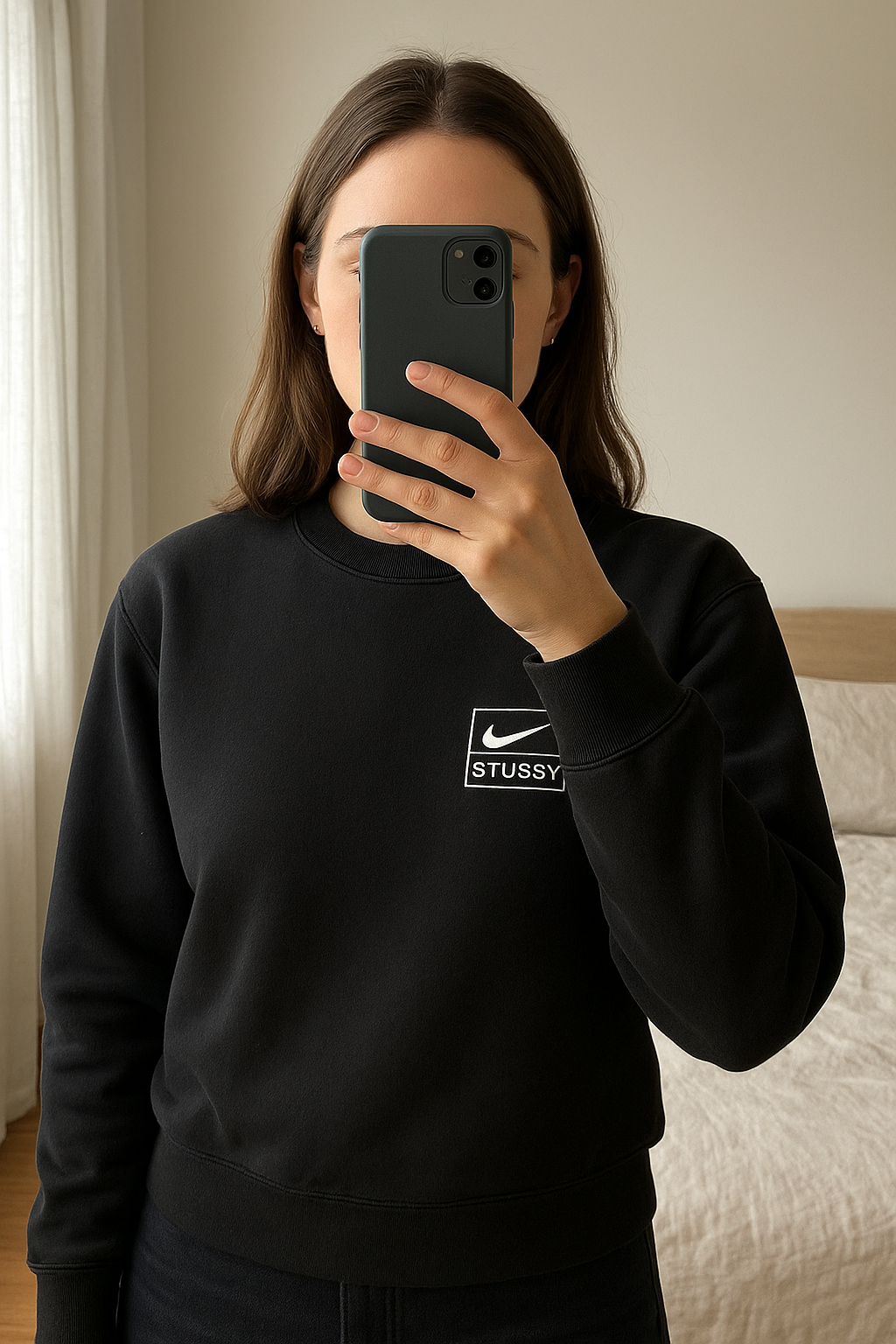 Nike x Stüssy Pull noir et blanc – Col rond, Taille M debout, face à la caméra, dans une chambre à la lumière douce, avec une lumière naturelle filtrant par la fenêtre.