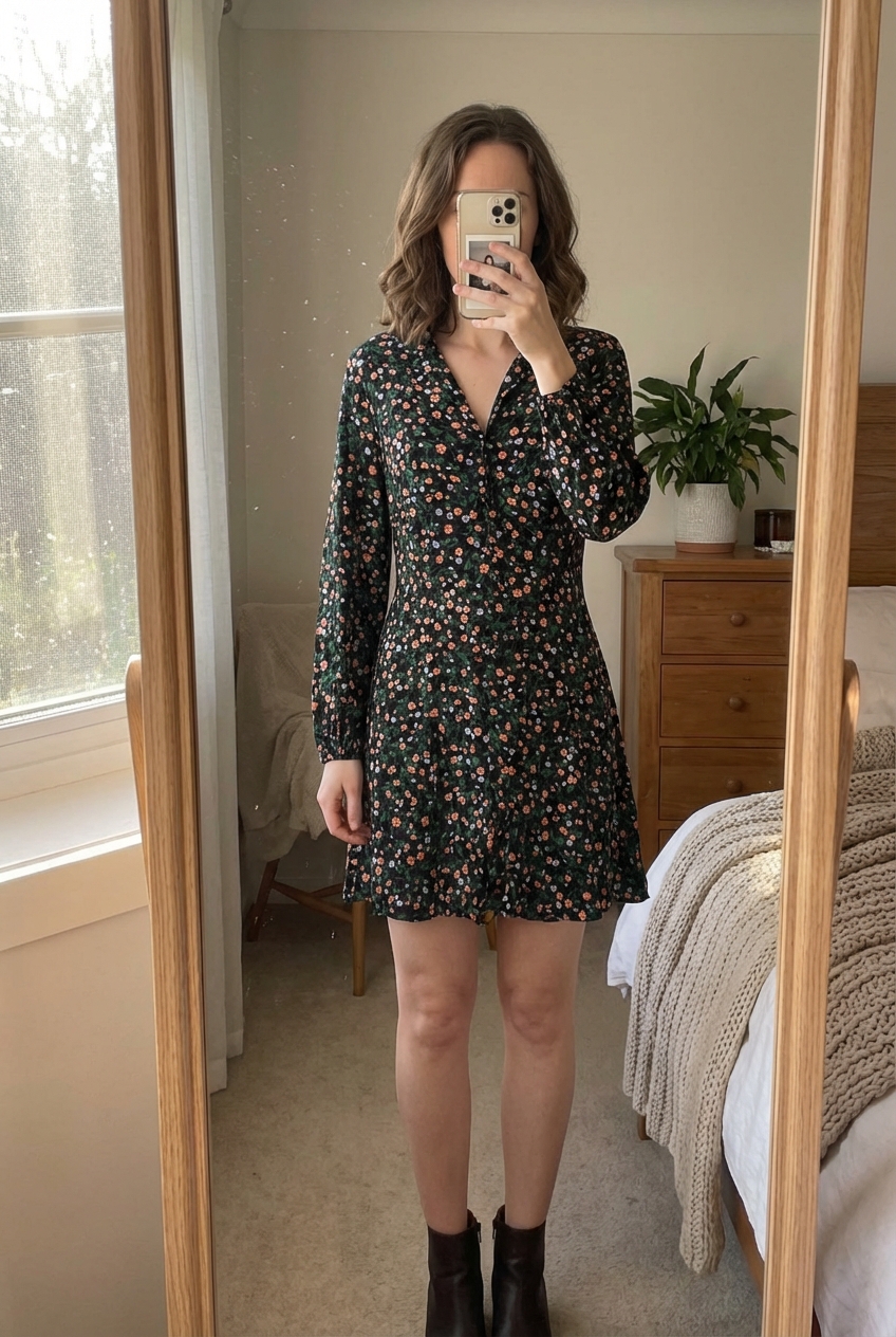 Nobody’s Child’s Size 12 Floral Tea Dress Long Sleeves with tie waist on-trend bright print standing straight facing the camera, in a softly lit bedroom setting, with gentle natural light filtering through a window.