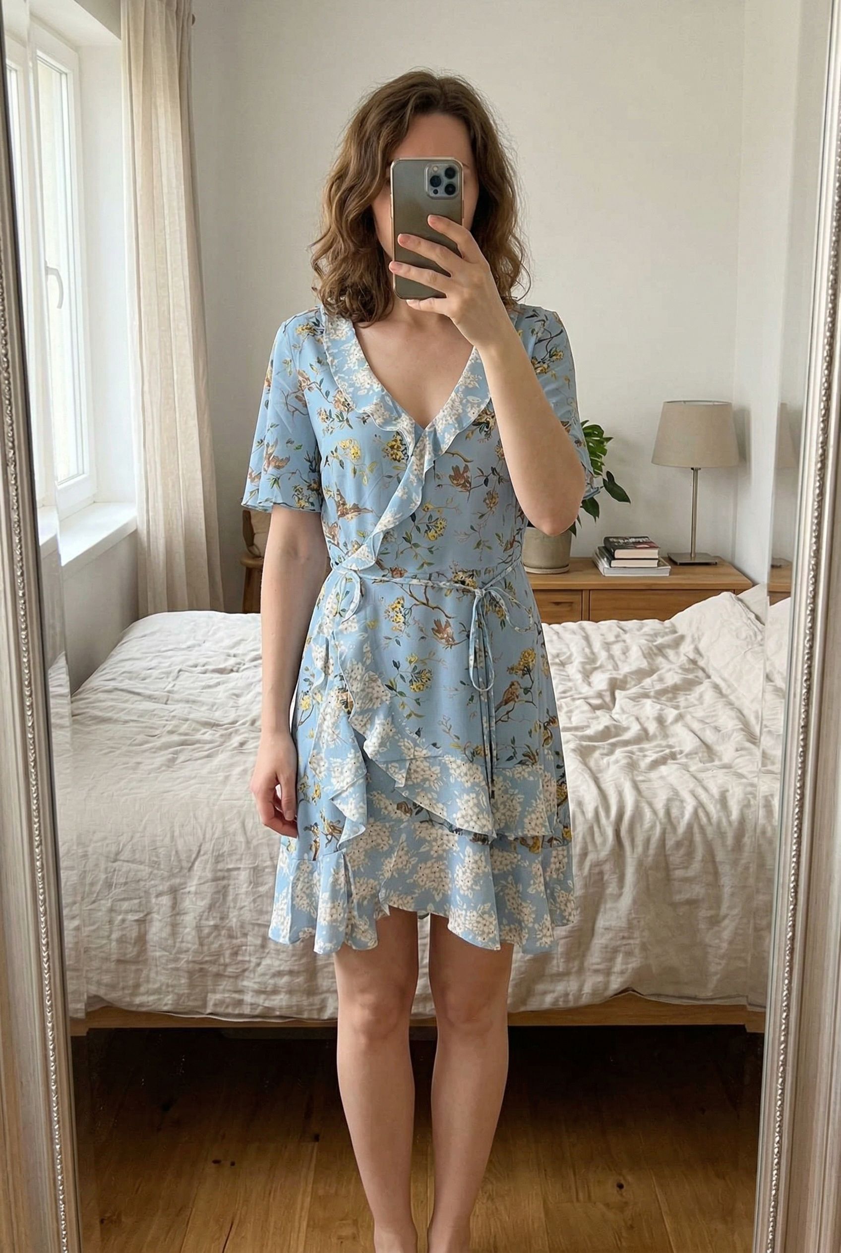 Oasis Blue Floral Bird Print Wrap Dress Ruffle Hem Tea Dress Size 14 standing straight facing the camera, in a softly lit bedroom setting, with gentle natural light filtering through a window.