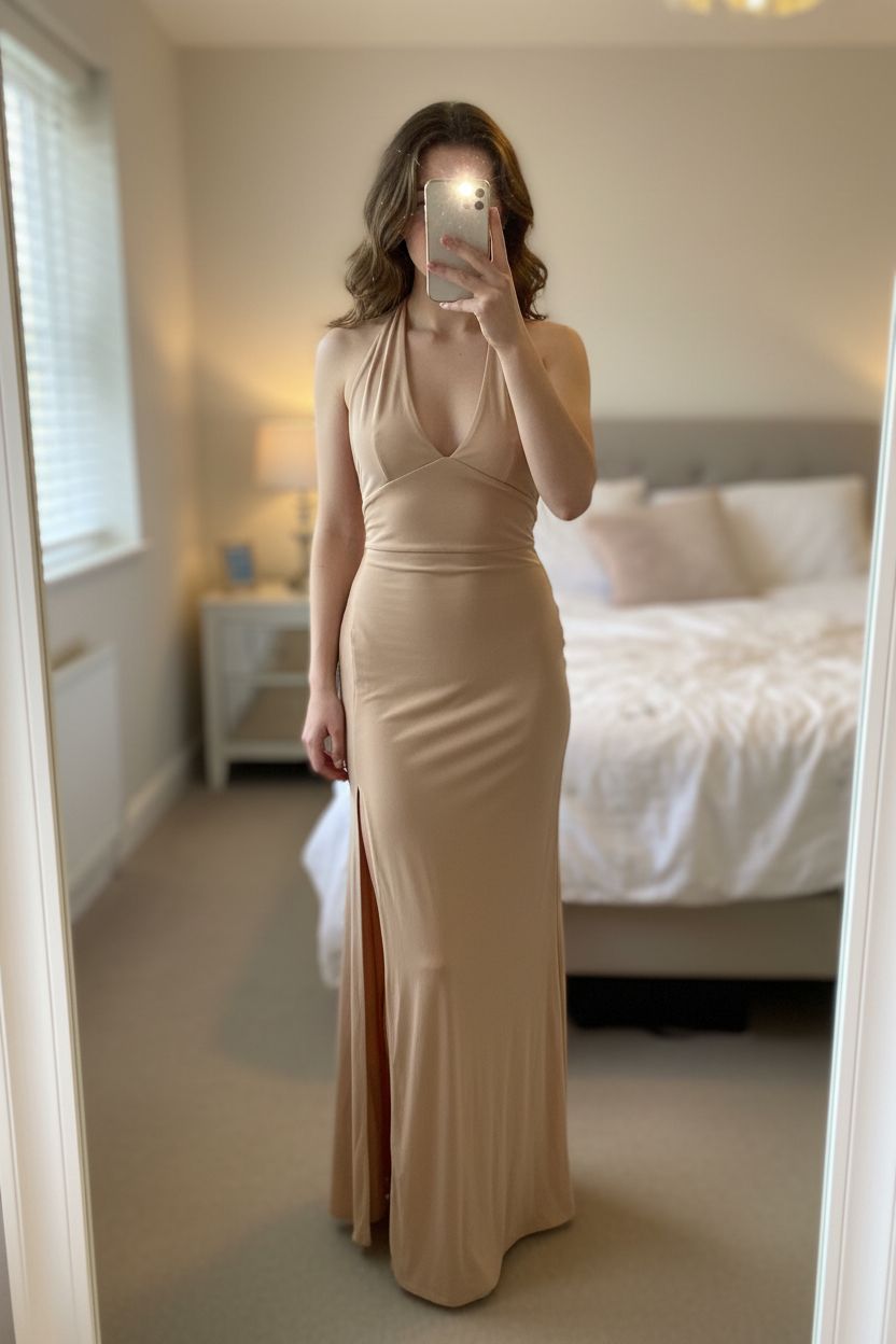Oh Polly nude beige halter neck maxi dress UK 4 6 minimalist evening standing straight facing the camera, in a softly lit bedroom setting, with gentle natural light filtering through a window.