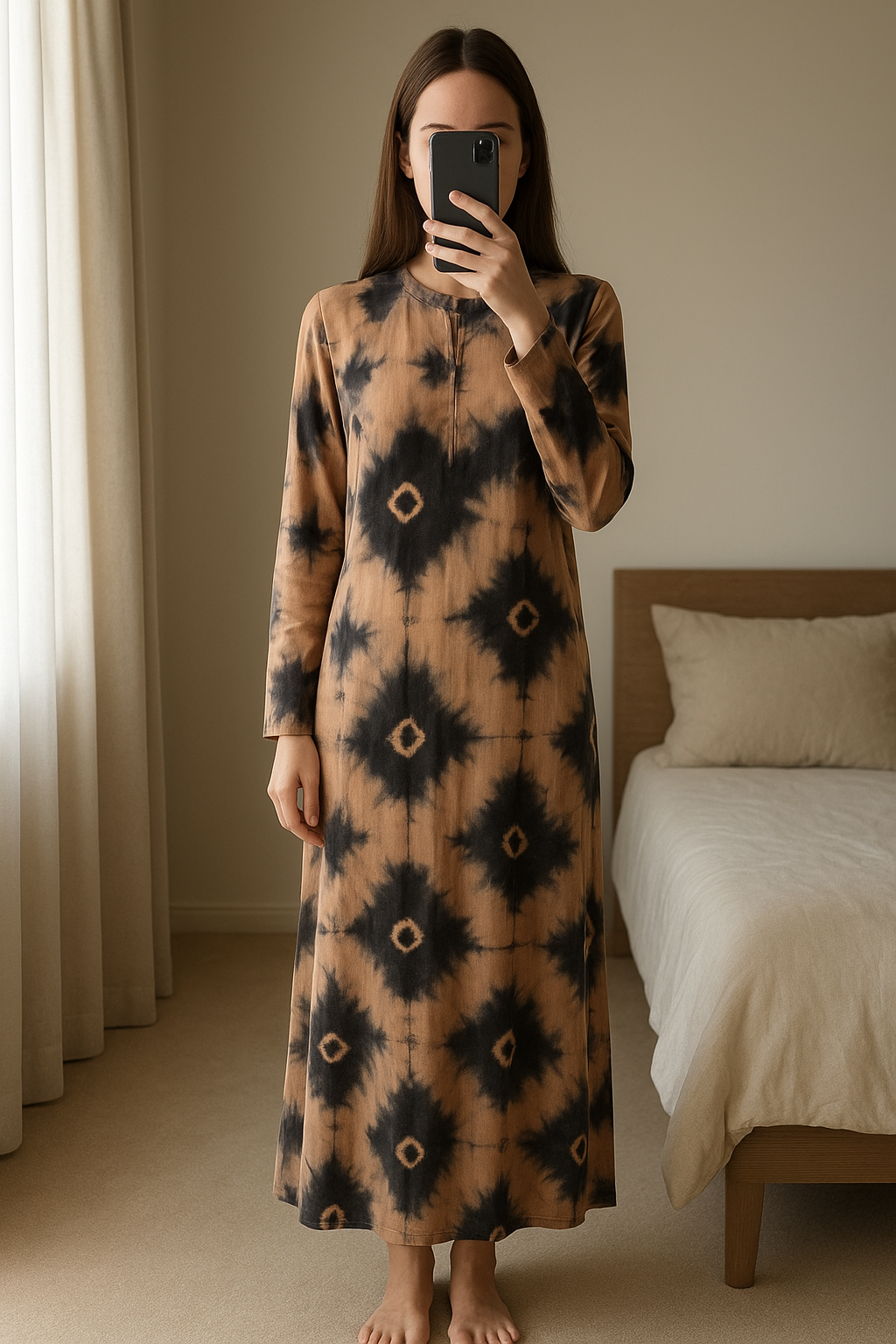 Open back tie dye dress standing straight facing the camera, in a softly lit bedroom setting, with gentle natural light filtering through a window.
