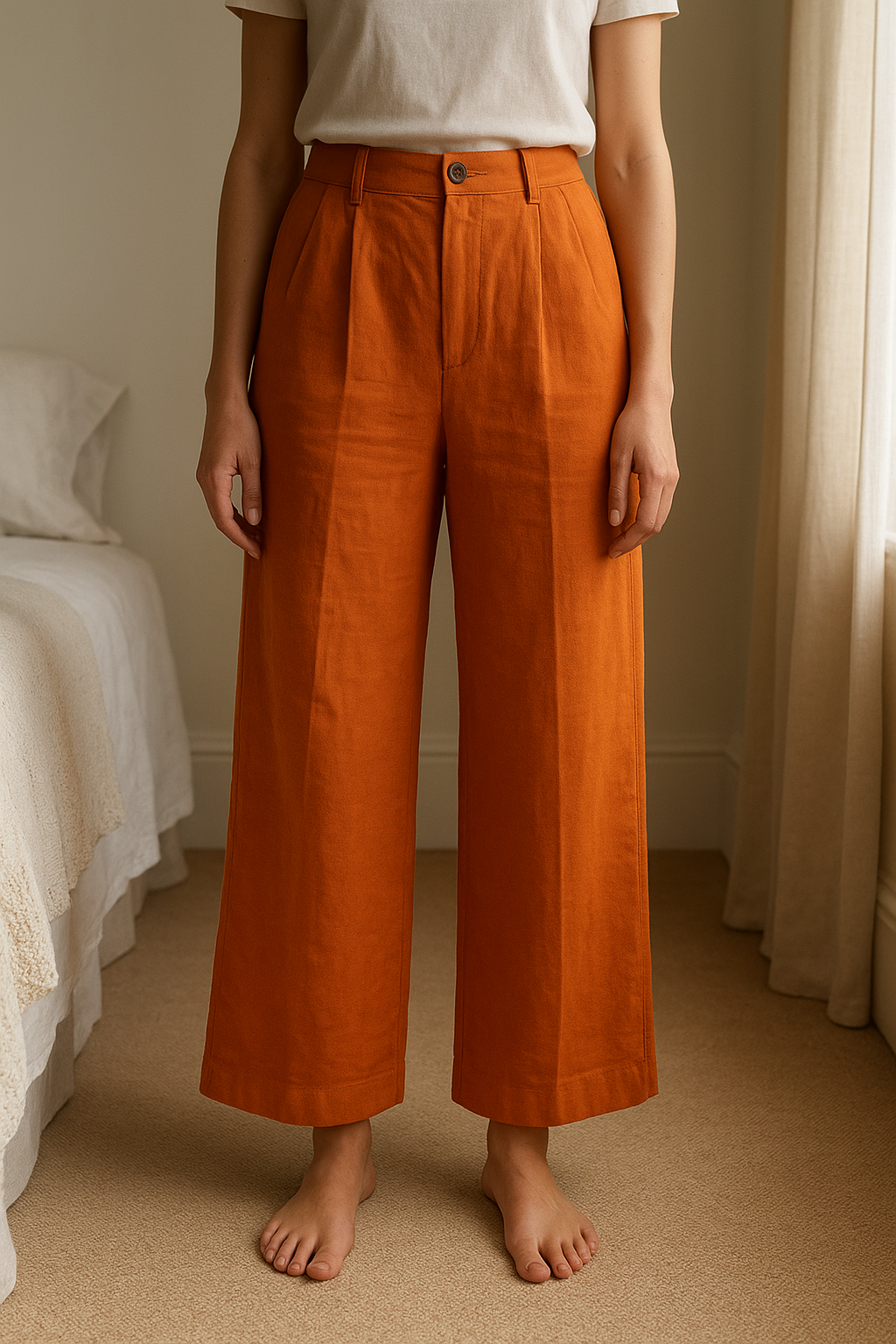 Orange next trousers woman’s size12 standing straight facing the camera, in a softly lit bedroom setting, with gentle natural light filtering through a window.