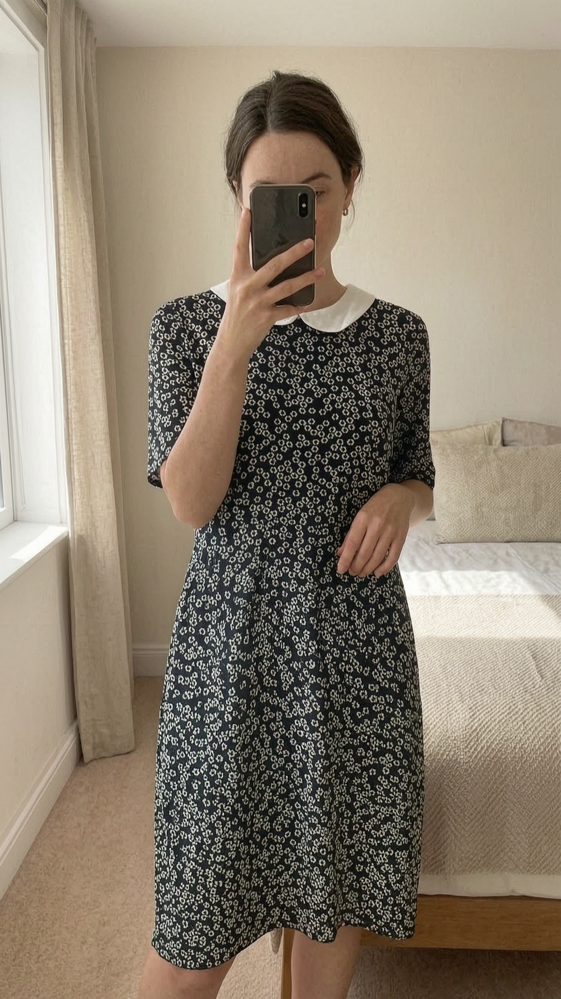 Orla Kiely Black Floral Dress UK 10 Peter Pan Collar Retro standing straight facing the camera, in a softly lit bedroom setting, with gentle natural light filtering through a window.