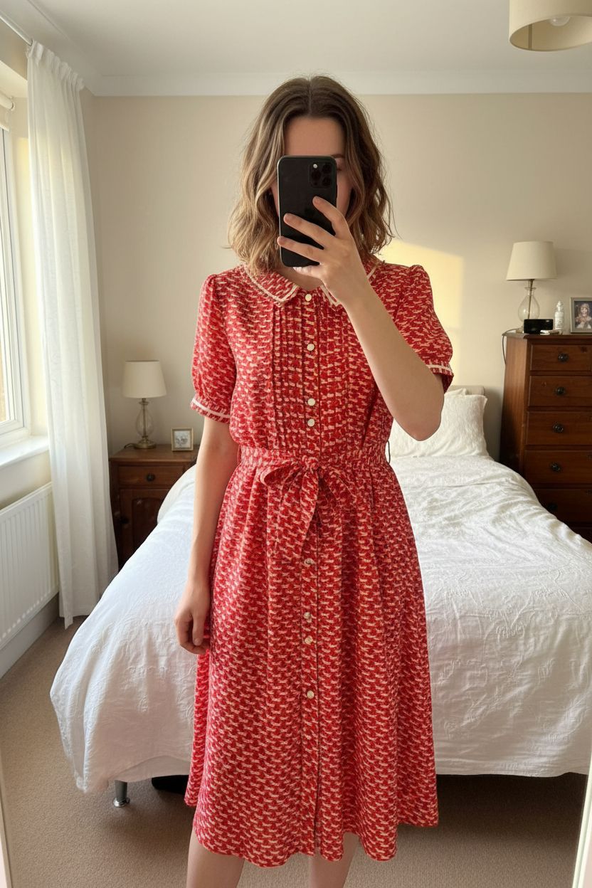Orla Kiely Red Silk Printed Shirt Dress standing straight facing the camera, in a softly lit bedroom setting, with gentle natural light filtering through a window.