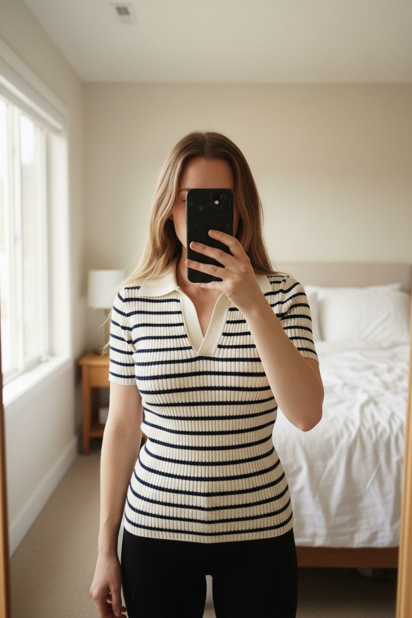 & Other Stories Paris Atelier Striped Polo Top Size XS Cream Navy Ribbed Knit Coastal standing straight facing the camera, in a softly lit bedroom setting, with gentle natural light filtering through a window.