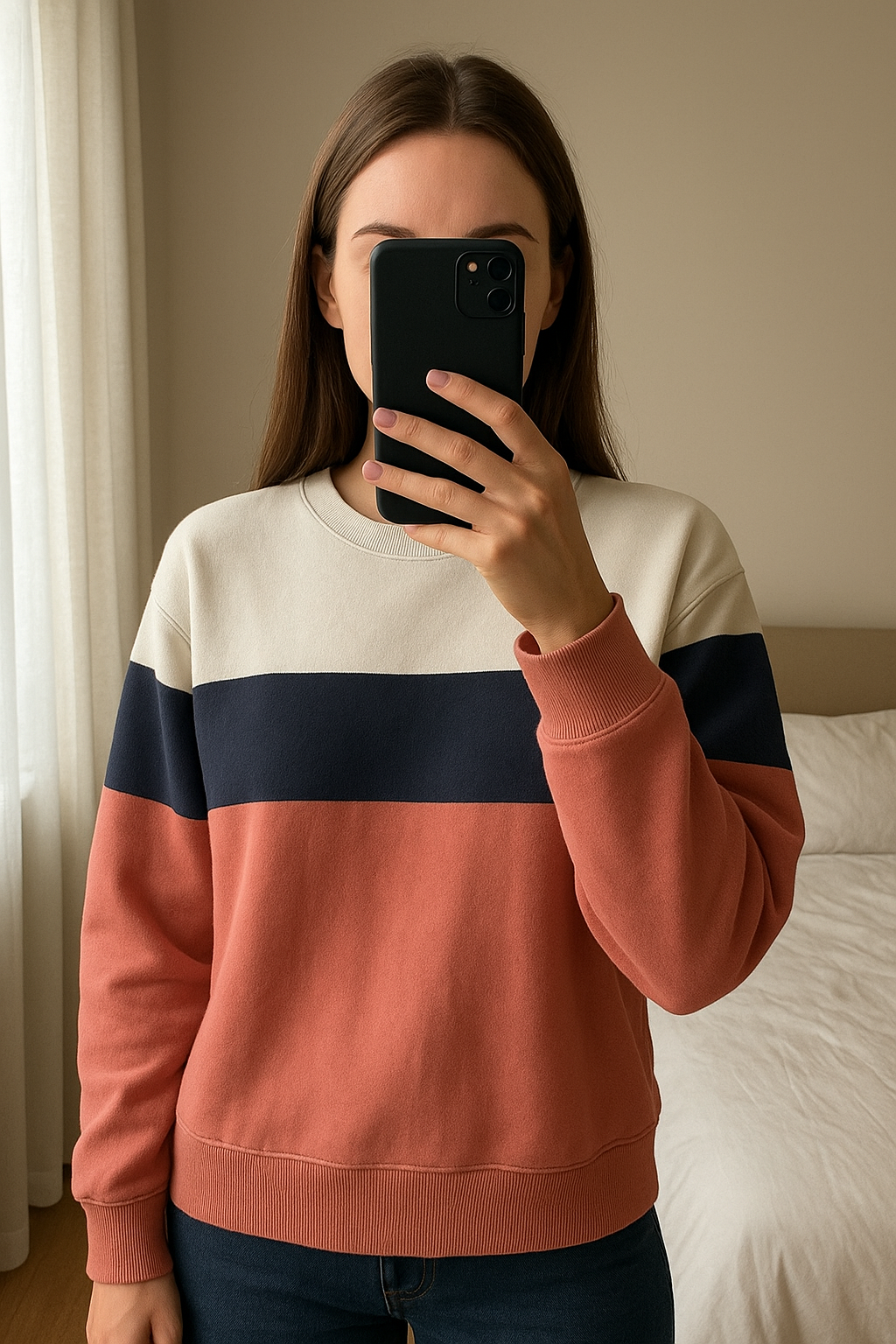 Oversized jumper standing straight facing the camera, in a softly lit bedroom setting, with gentle natural light filtering through a window.