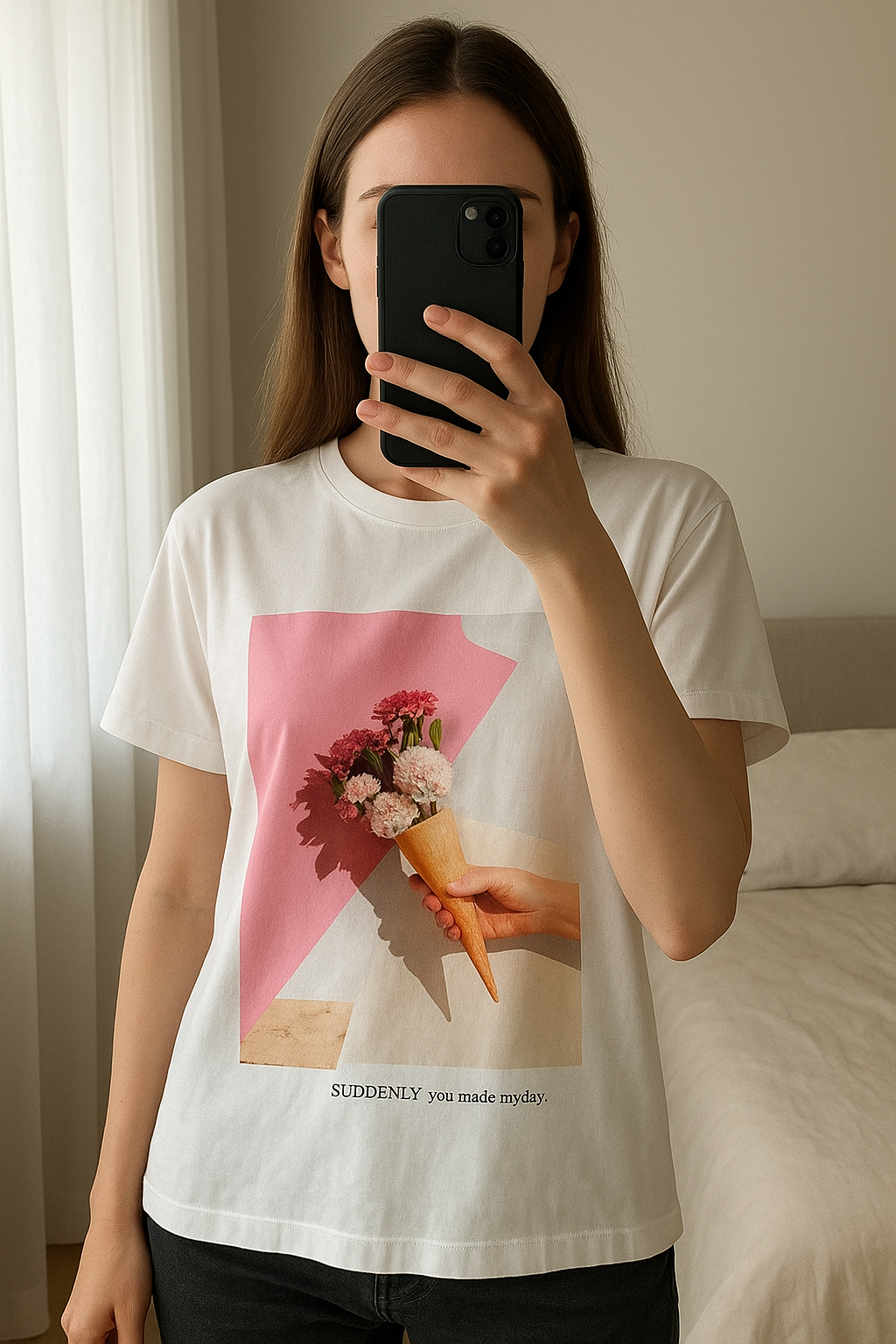 Oversized T-shirt/blouse standing straight facing the camera, in a softly lit bedroom setting, with gentle natural light filtering through a window.