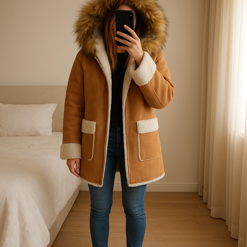 Płaszcz damski długi kożuszek, ocieplany z kapturem, jesień zima Zara standing straight facing the camera, in a softly lit bedroom setting, with gentle natural light filtering through a window.