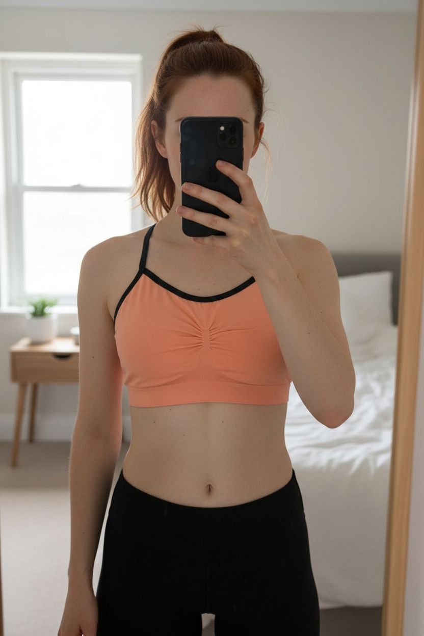 A person in Pale orange Sweaty Betty yoga sports bra crop top medium standing straight facing the camera, with a slim body type, in a softly lit bedroom setting, with gentle natural light filtering through a window.