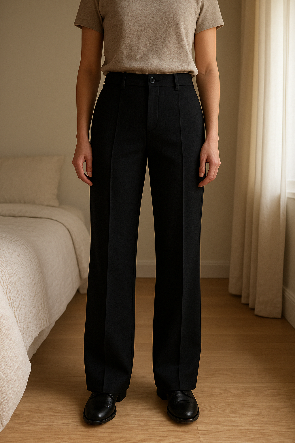 Pantalon debout, face à la caméra, dans une chambre à la lumière douce, avec une lumière naturelle filtrant par la fenêtre.