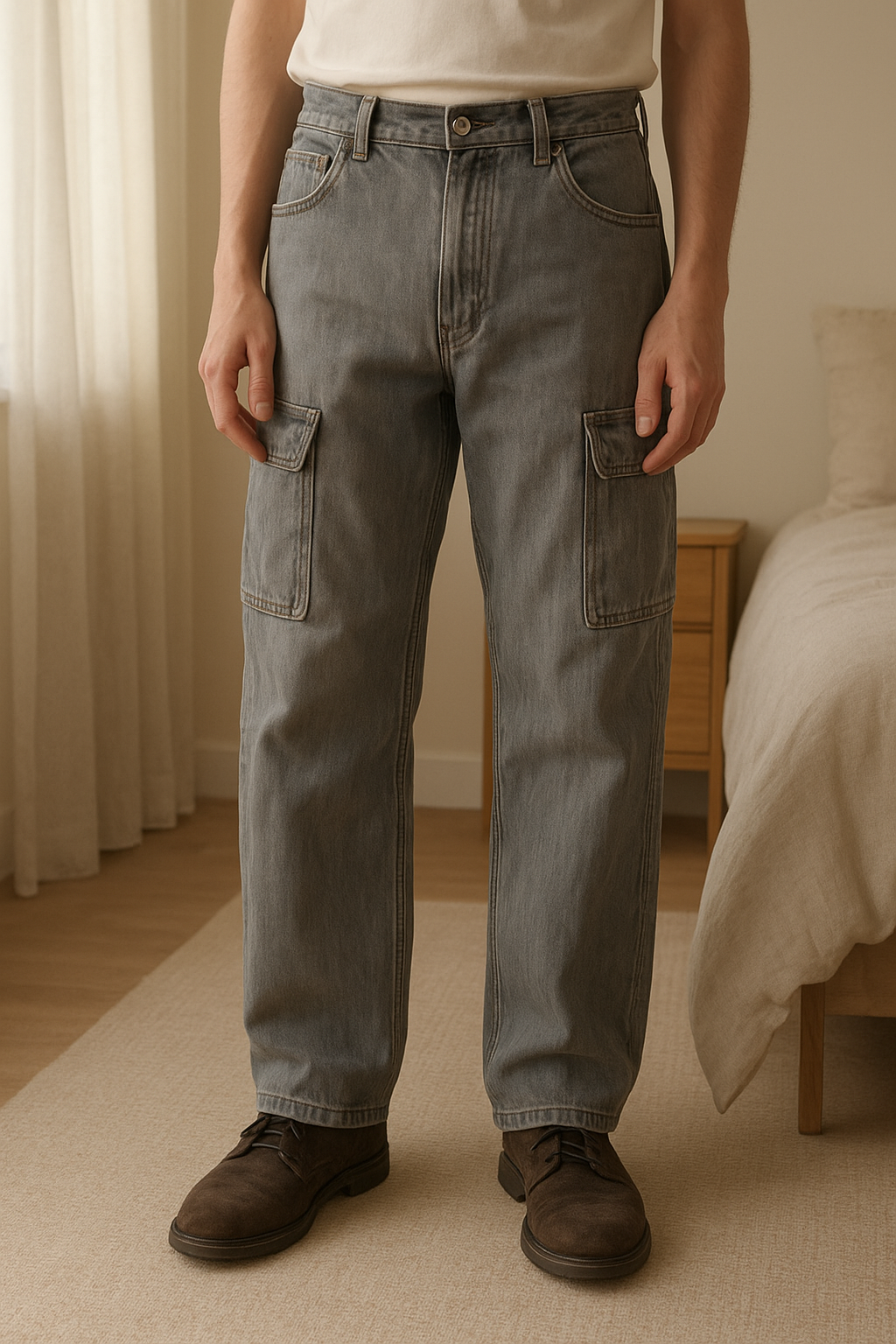 Pantalon baggy H&M debout, face à la caméra, dans une chambre à la lumière douce, avec une lumière naturelle filtrant par la fenêtre.