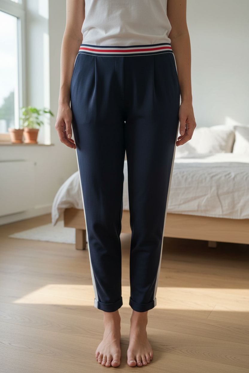 Pantalon chino Teddy Smith taille 42 bleu marine debout, face à la caméra, dans une chambre à la lumière douce, avec une lumière naturelle filtrant par la fenêtre.