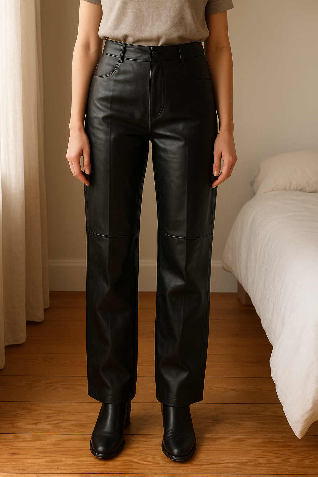 pantalon cuir pimkie 34 debout, face à la caméra, dans une chambre à la lumière douce, avec une lumière naturelle filtrant par la fenêtre.