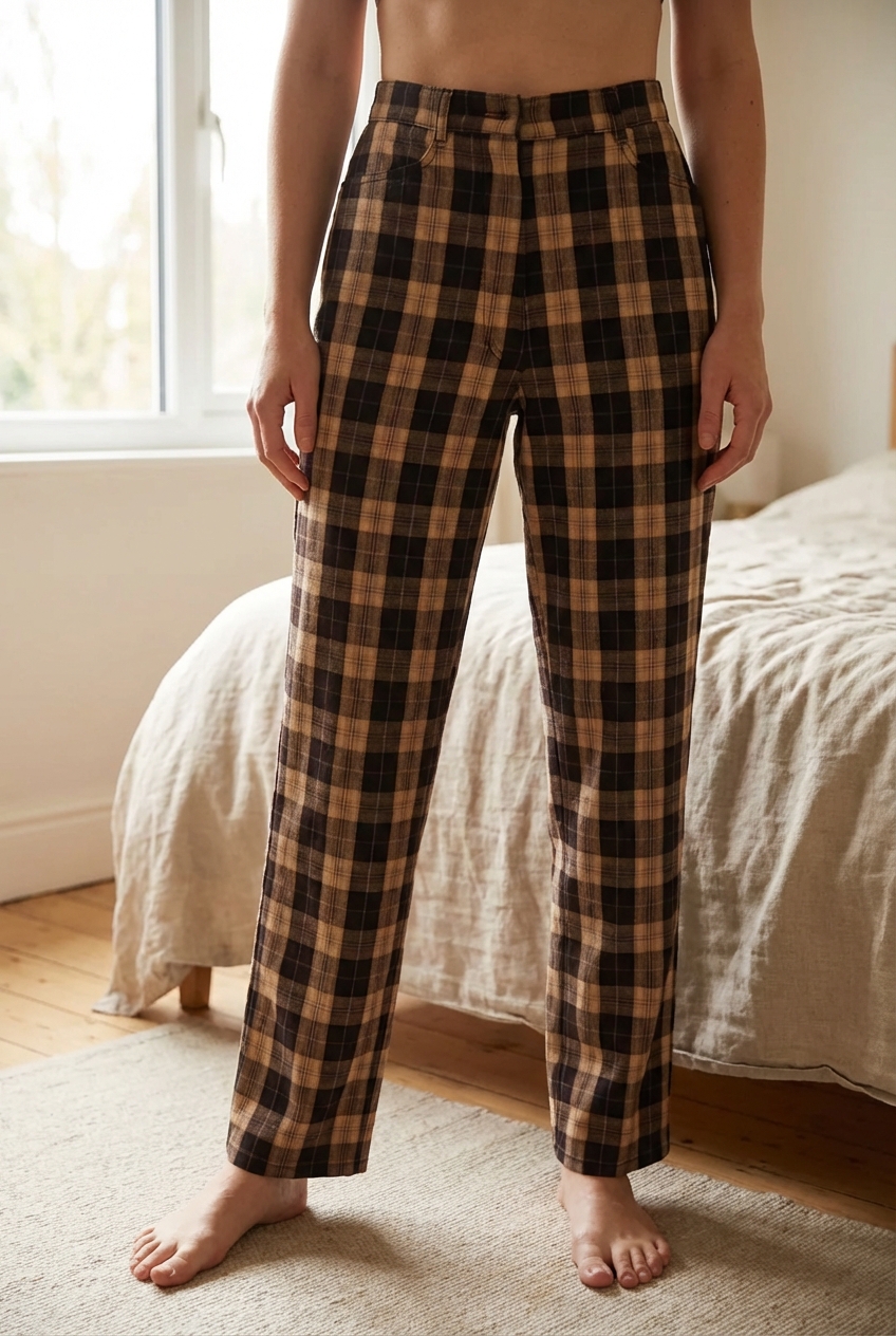 Pantalon de printemps Bonita debout, face à la caméra, dans une chambre à la lumière douce, avec une lumière naturelle filtrant par la fenêtre.