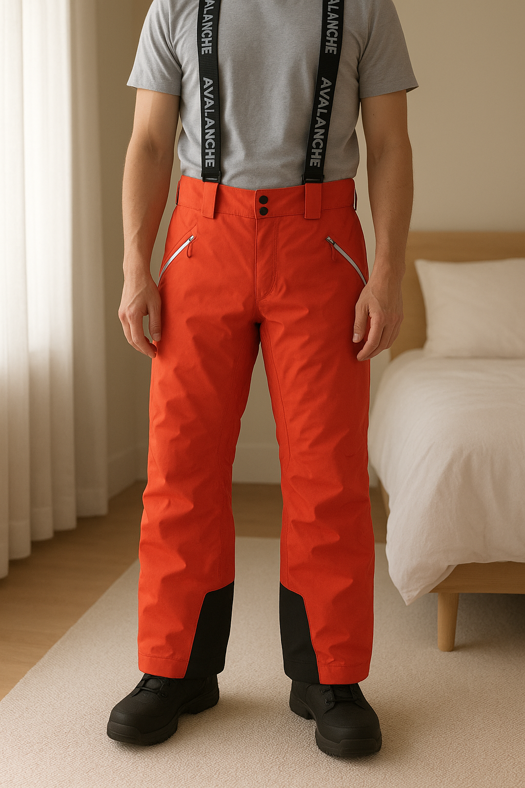 Pantalon de ski Avalanche debout, face à la caméra, dans une chambre à la lumière douce, avec une lumière naturelle filtrant par la fenêtre.