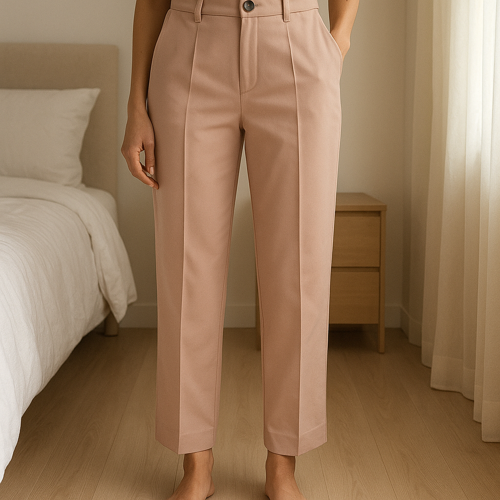 Pantalon droit beige debout, face à la caméra, dans une chambre à la lumière douce, avec une lumière naturelle filtrant par la fenêtre.