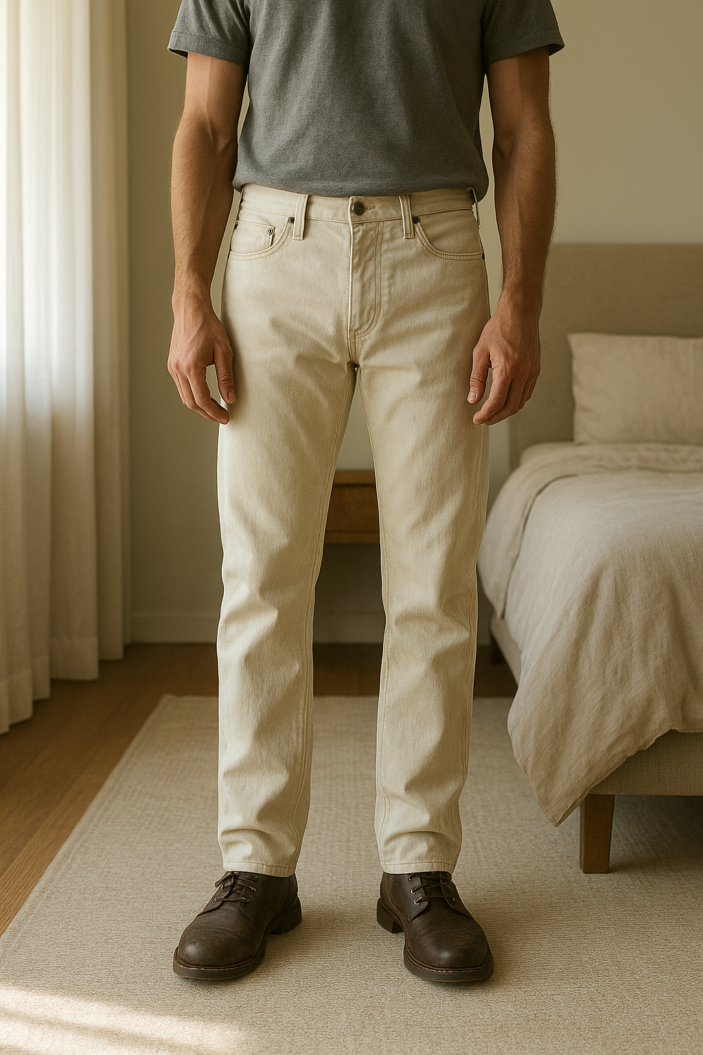Pantalon jeans SLIM milk Faith taille 30 debout, face à la caméra, dans une chambre à la lumière douce, avec une lumière naturelle filtrant par la fenêtre.