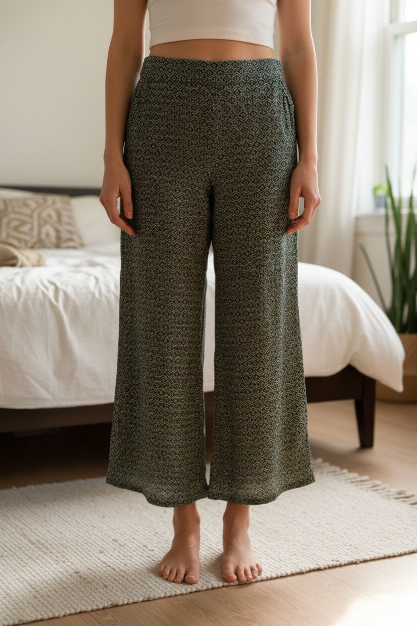 Pantalon large fluide vert imprimé géométrique – style bohème debout, face à la caméra, dans une chambre à la lumière douce, avec une lumière naturelle filtrant par la fenêtre.
