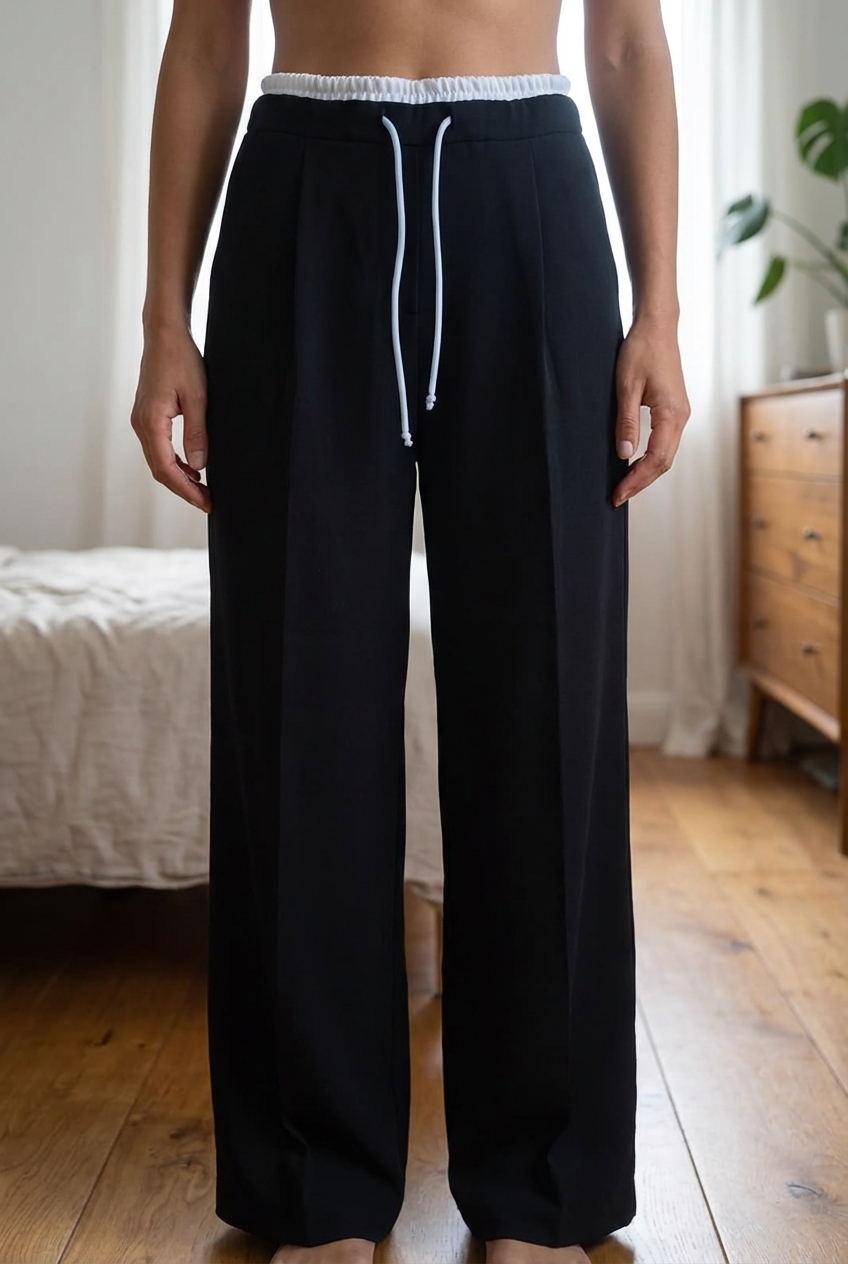 Une personne en Pantalon large noir chic & comfy - Neuf - taille élastique debout, face à la caméra, avec une silhouette fine, dans une chambre à la lumière douce, avec une lumière naturelle filtrant par la fenêtre.