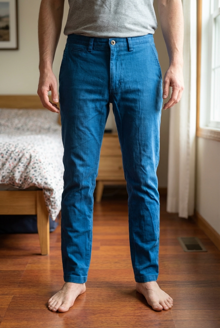Pantalon Misericordia debout, face à la caméra, dans une chambre à la lumière douce, avec une lumière naturelle filtrant par la fenêtre.