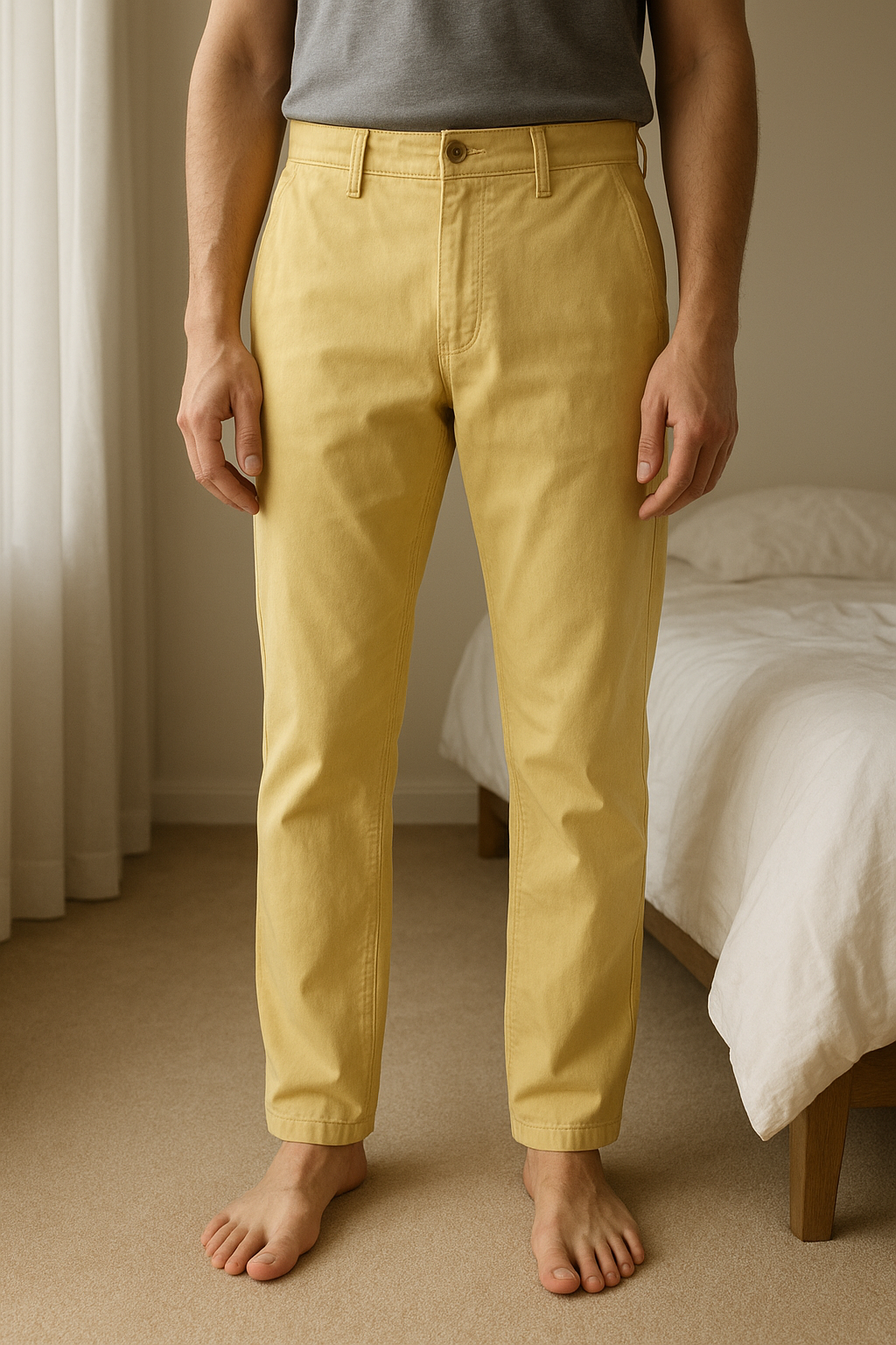 Pantalon neuf avec étiquette/Camaieu debout, face à la caméra, dans une chambre à la lumière douce, avec une lumière naturelle filtrant par la fenêtre.