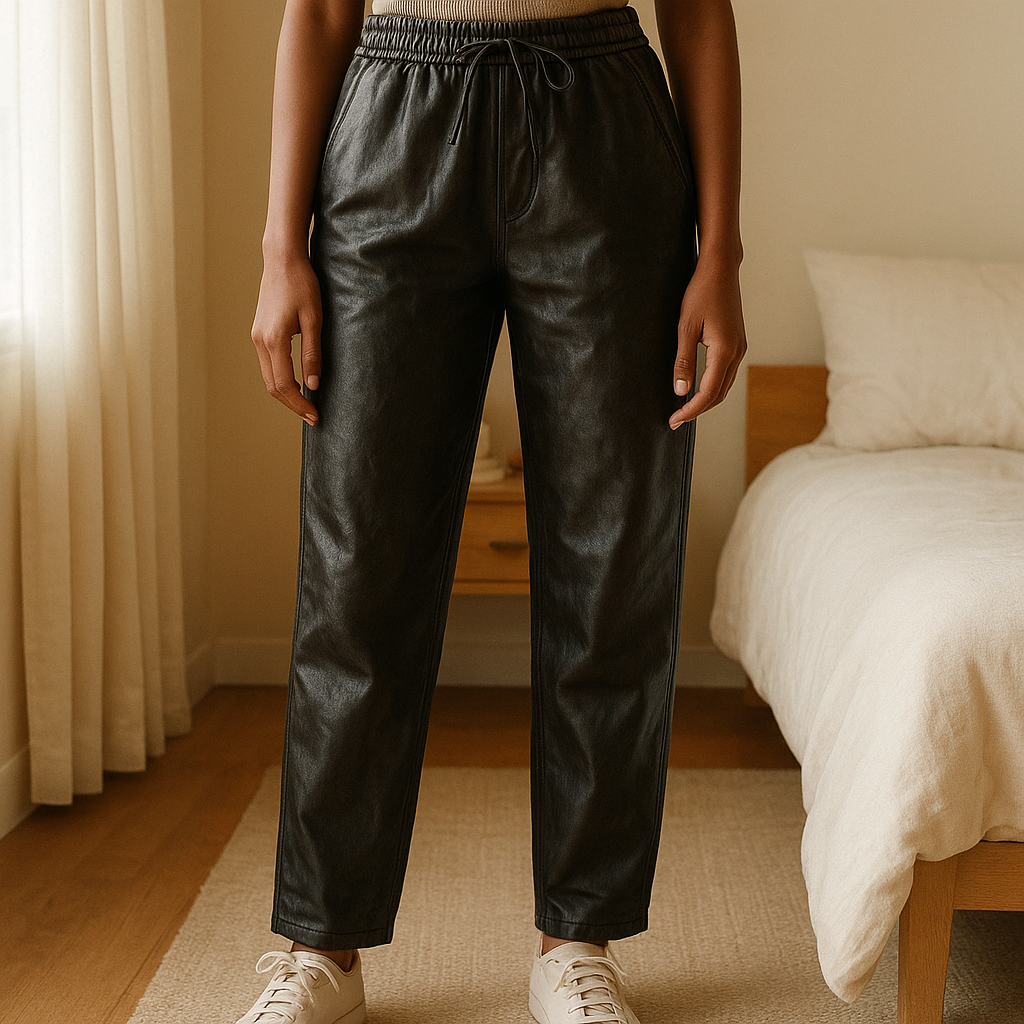 Une personne en Pantalon noir Simili cuir Zara debout, face à la caméra, avec une silhouette fine, dans une chambre à la lumière douce, avec une lumière naturelle filtrant par la fenêtre.