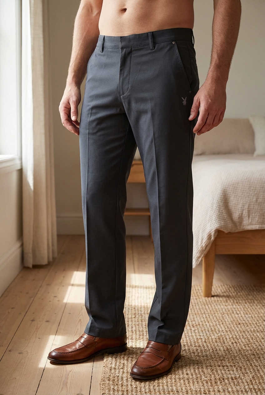 Pantalon Playboy Golf debout, face à la caméra, dans une chambre à la lumière douce, avec une lumière naturelle filtrant par la fenêtre.