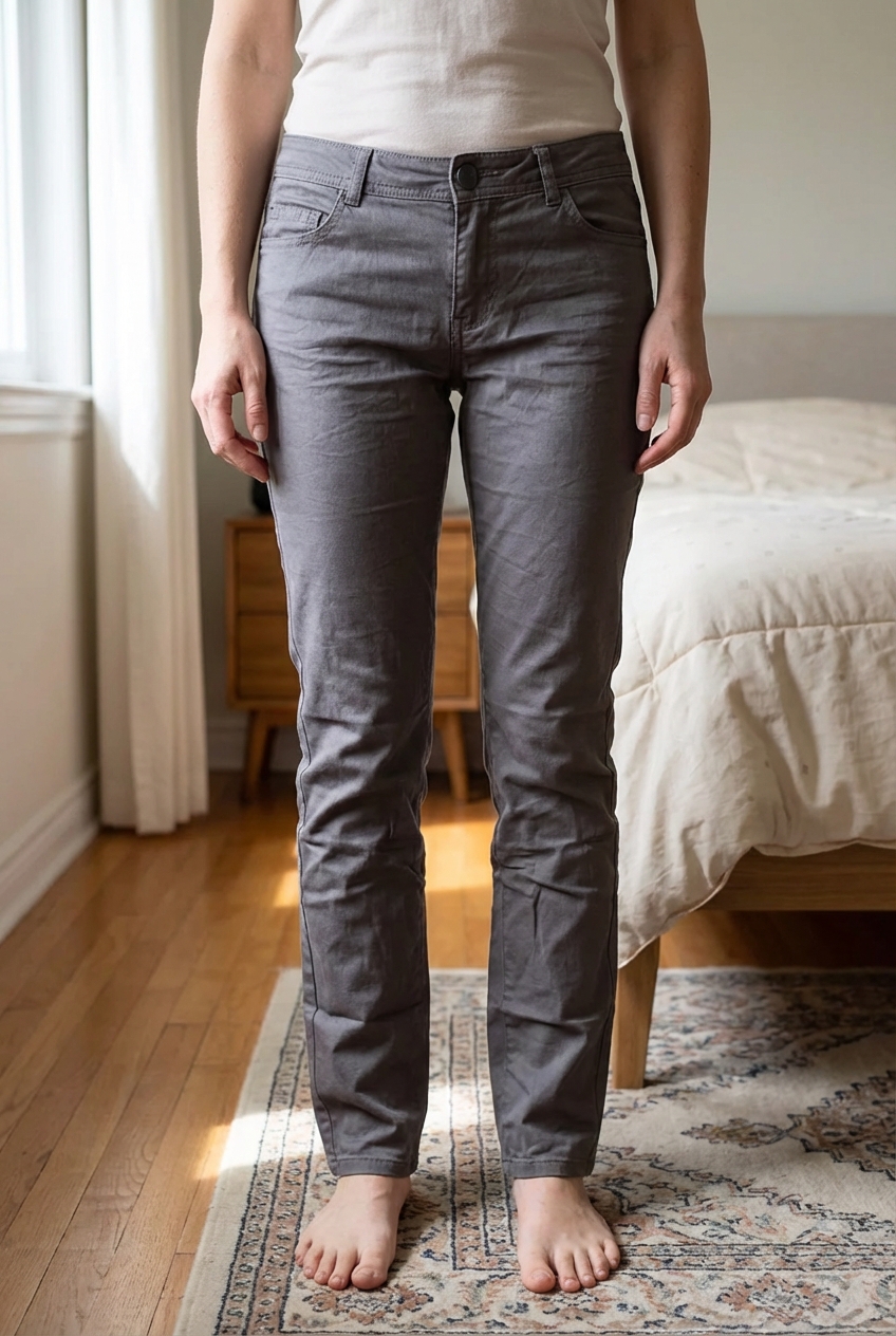 Pantalon slip gris H&M debout, face à la caméra, dans une chambre à la lumière douce, avec une lumière naturelle filtrant par la fenêtre.