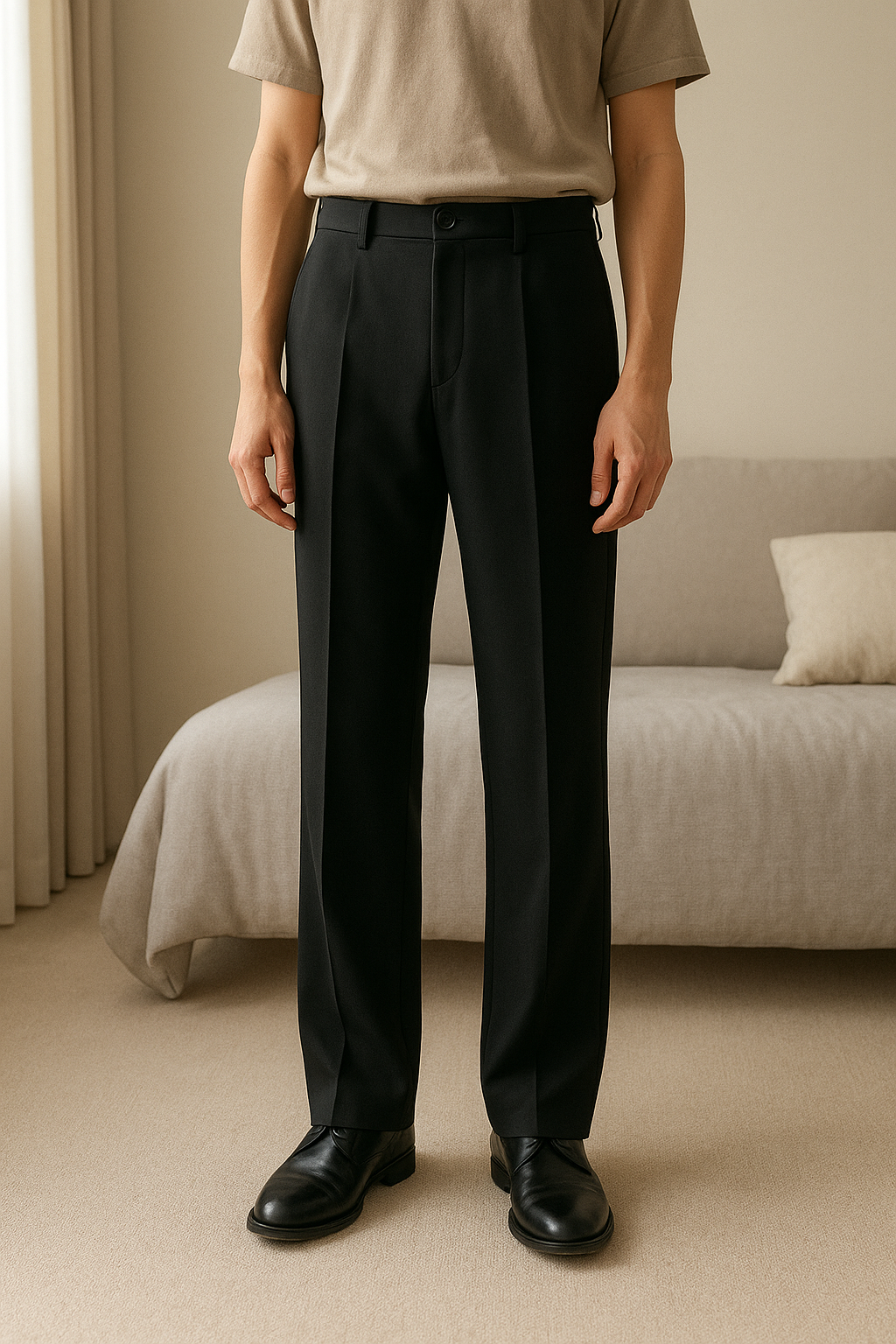 Pantalon toile debout, face à la caméra, dans une chambre à la lumière douce, avec une lumière naturelle filtrant par la fenêtre.