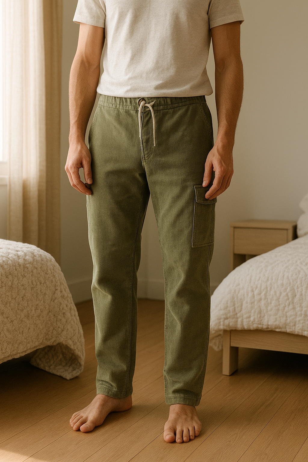 Pantalon velours homme Bizzbee - Taille L - Neuf debout, face à la caméra, dans une chambre à la lumière douce, avec une lumière naturelle filtrant par la fenêtre.