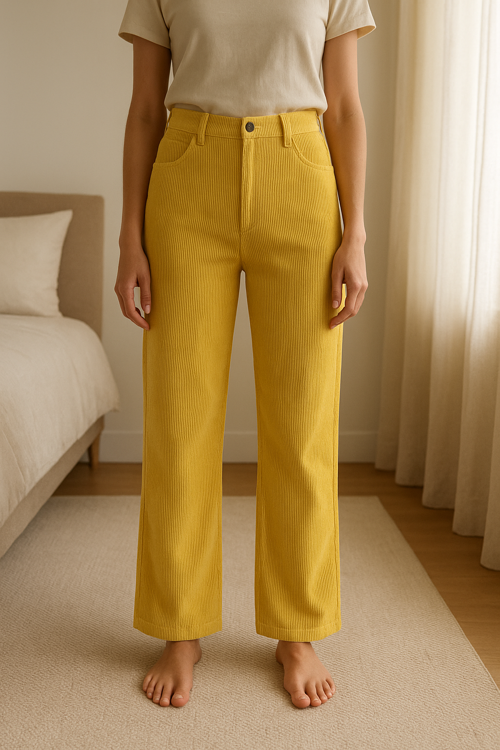 Pantalon velours jaune S - Pantaloni Donna giallo second female in piedi, rivolto verso la fotocamera, in una camera da letto con luce soffusa e luce naturale che filtra dalla finestra.