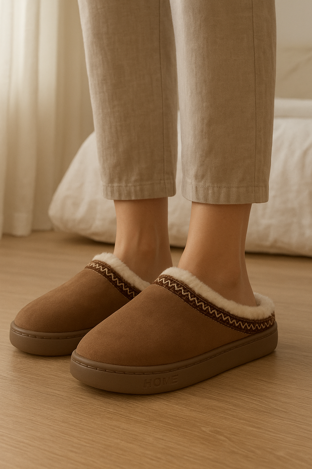 Pantoufles Chaussons Taupe NEUF 40 debout, face à la caméra, dans une chambre à la lumière douce, avec une lumière naturelle filtrant par la fenêtre.